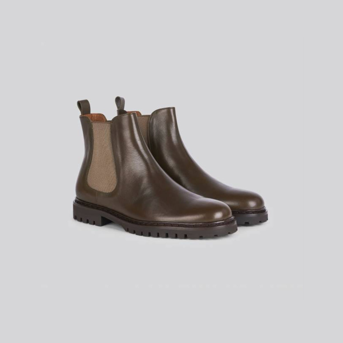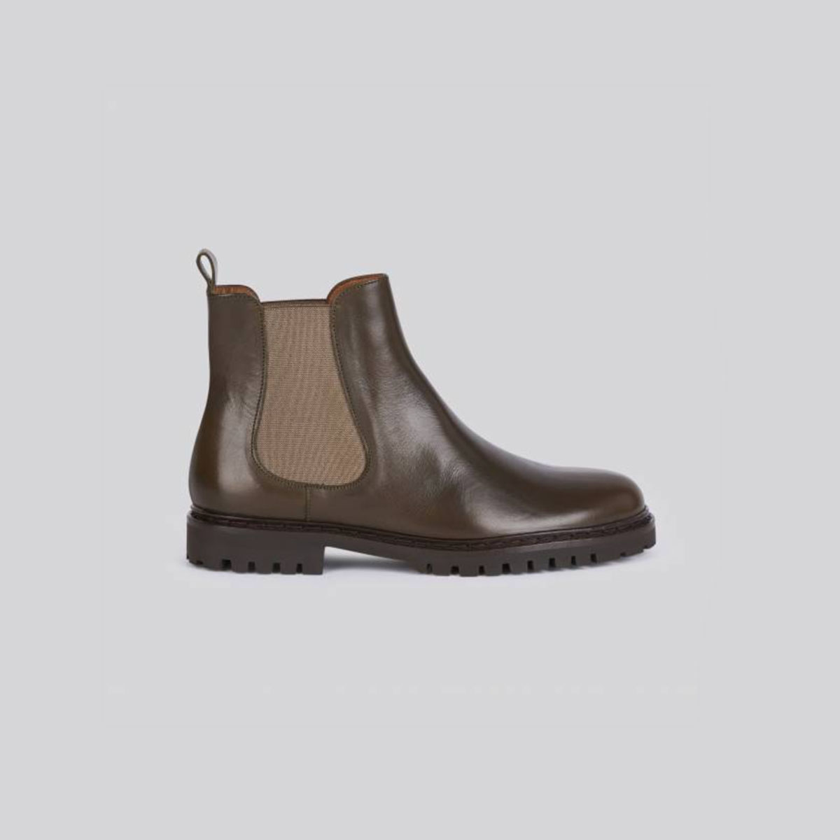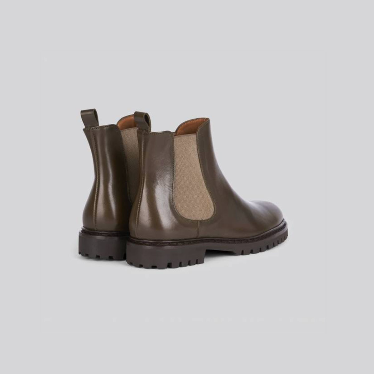 Réalisation : Boots Chelsea en cuir kaki, bout rond, élastiquée à la cheville, languette au dos.