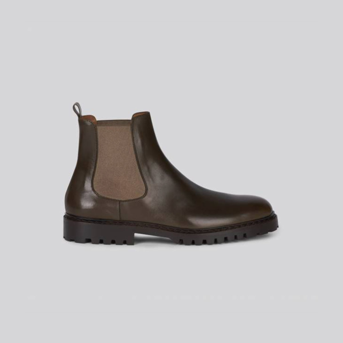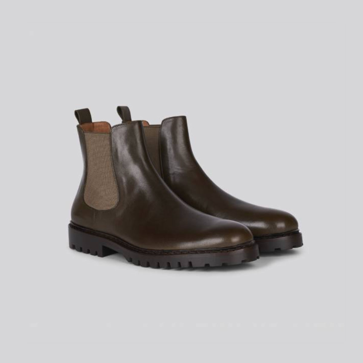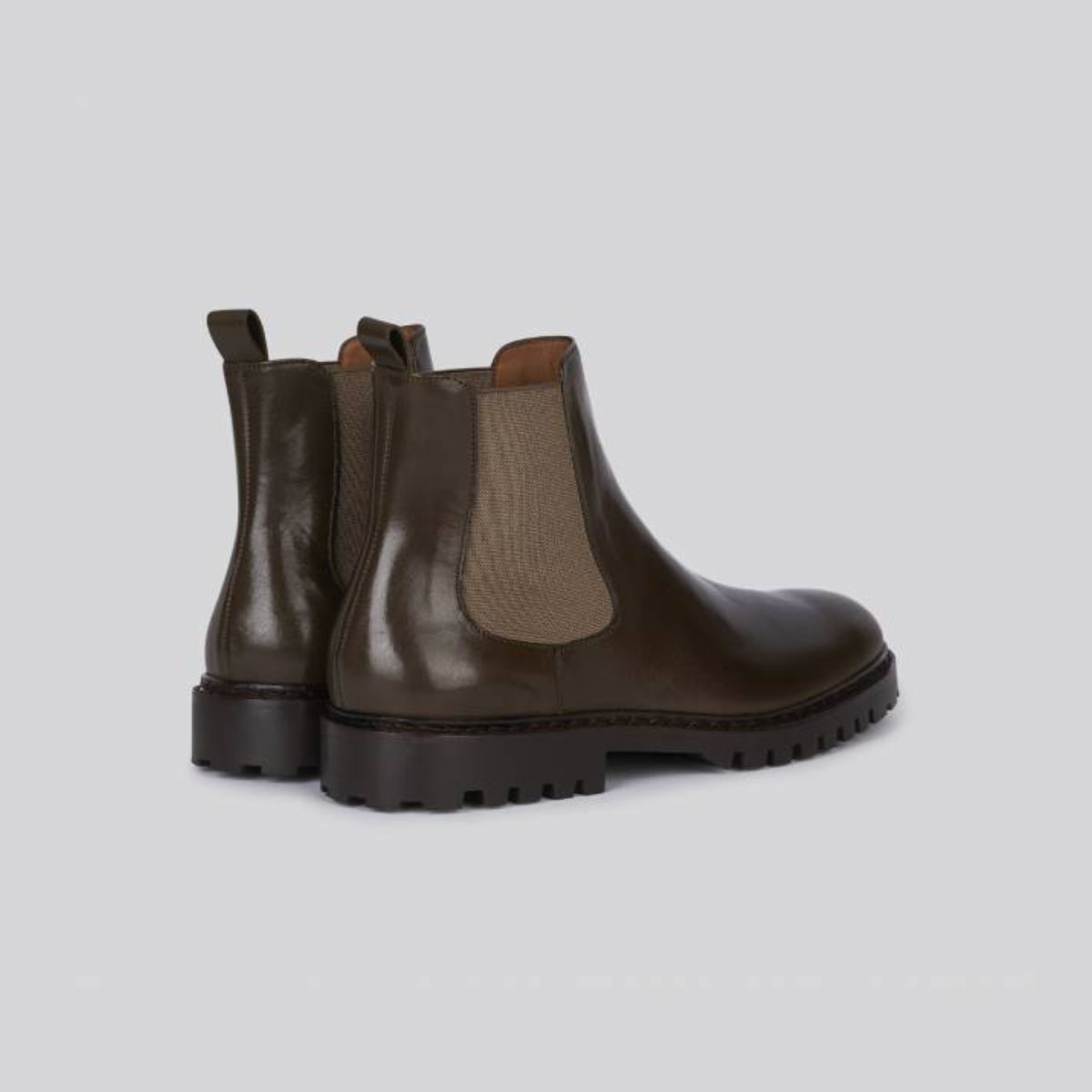 Réalisation : Boots Chelsea en cuir à tannage Vegetal kaki, bout rond, élastiquée à la cheville, languette au dos.
