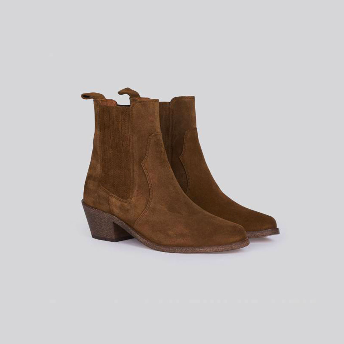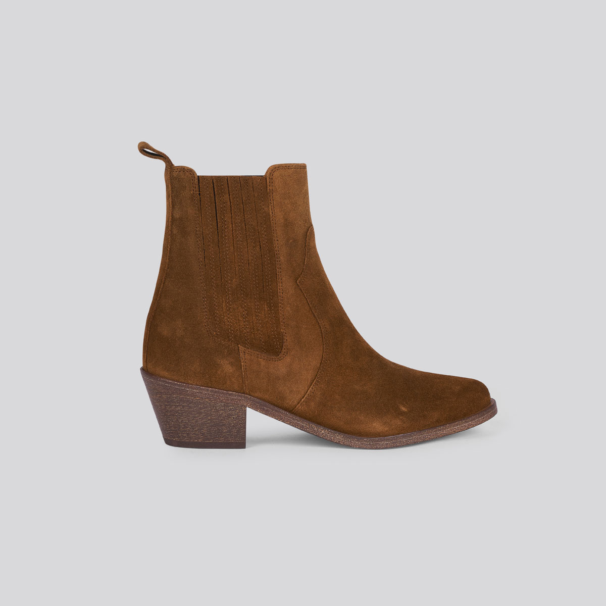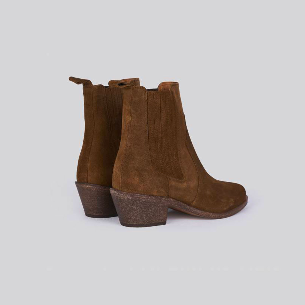Réalisation : Boots Sofia en daim couleur tabac 409, bouts pointus, bandes élastiquées recouvertes de daim des deux côtés, coutures western marquées, languette tire-botte sur l’arrière, talons larges marron de 5 cm de haut.