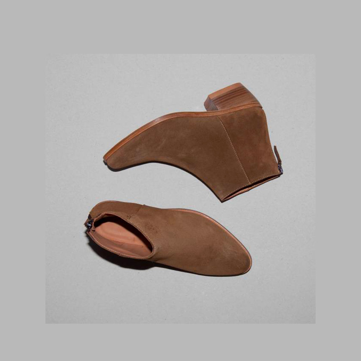 Réalisation : Boots Telma en daim couleur tabac, bouts pointus, surpiqûres apparentes, fermeture zippée sur l’arrière, talons larges de 5 cm de haut.