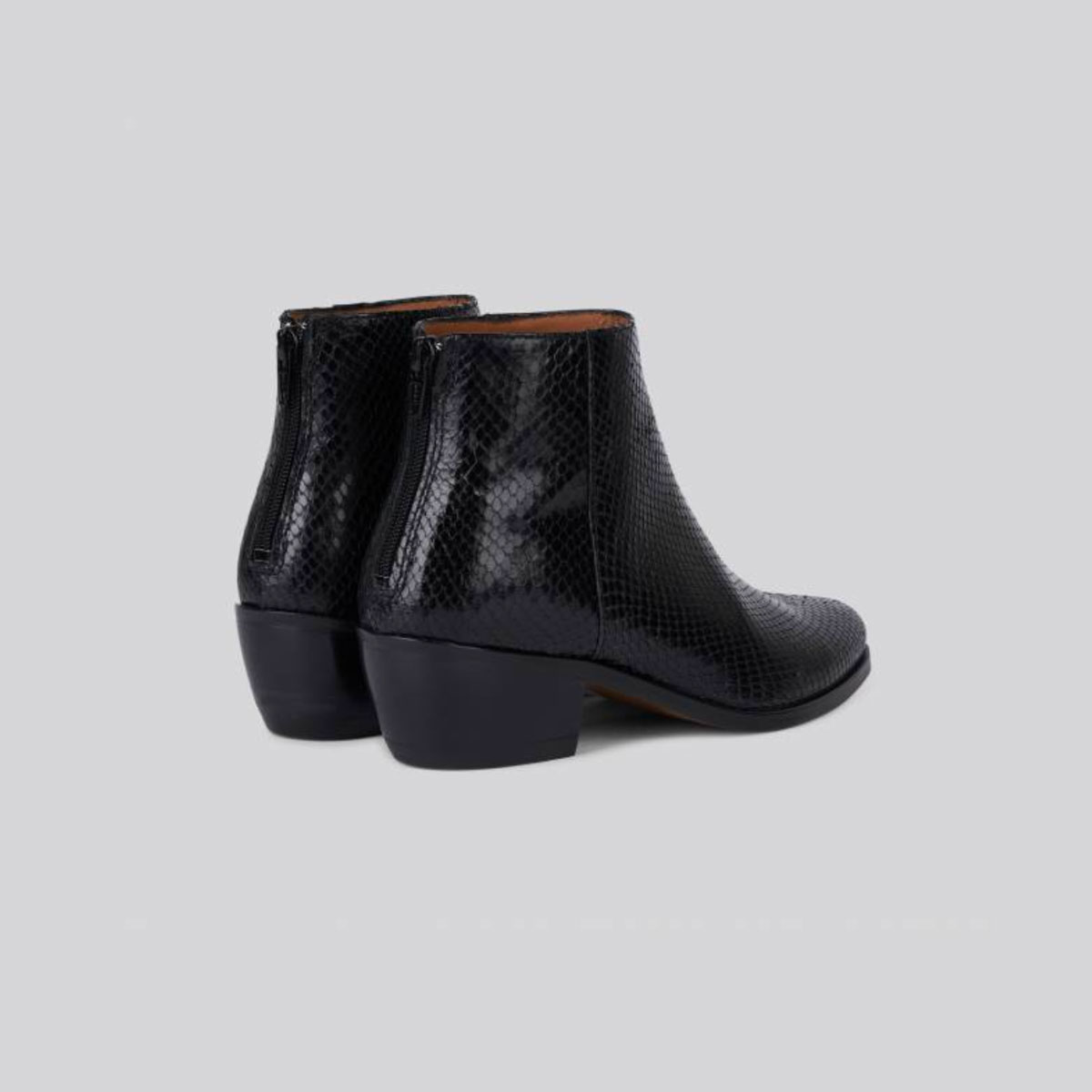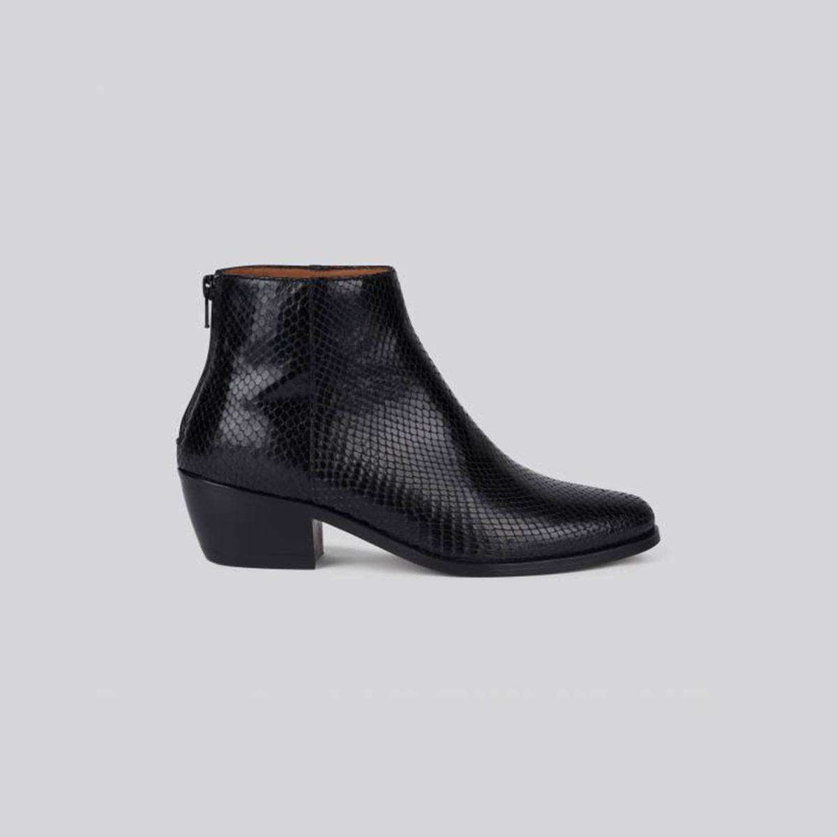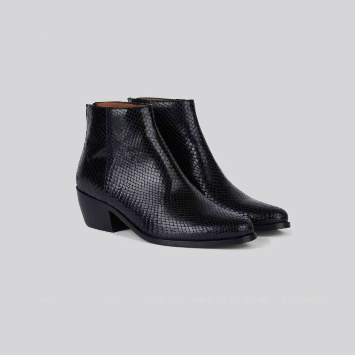 Réalisation : Boots Telma en cuir effet python, bouts pointus, surpiqûres apparentes, fermeture zippée sur l’arrière, talons larges de 5 cm de haut.