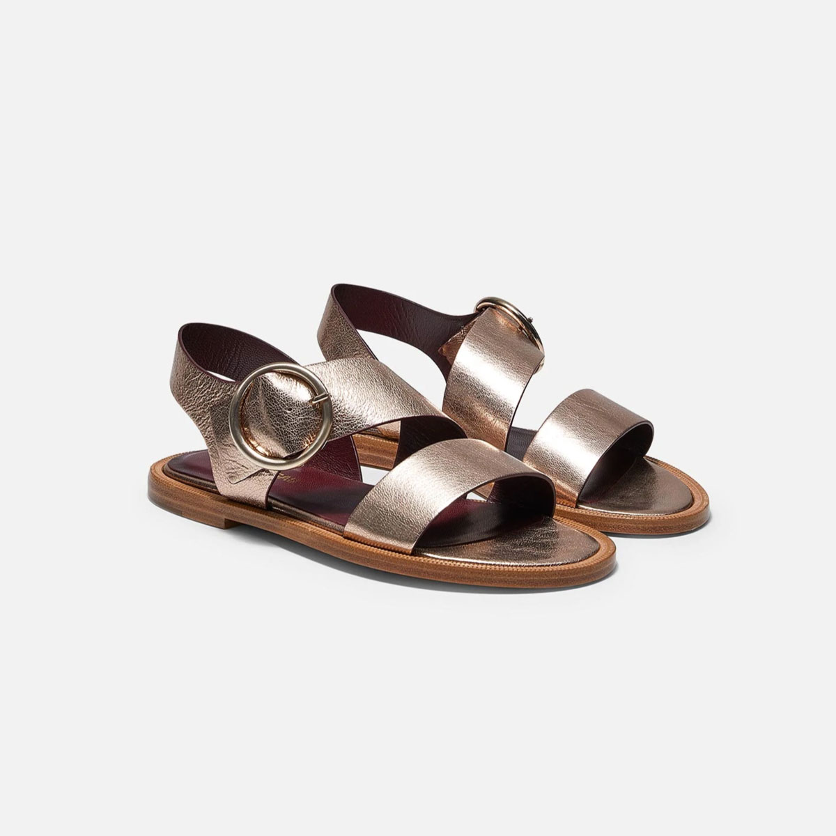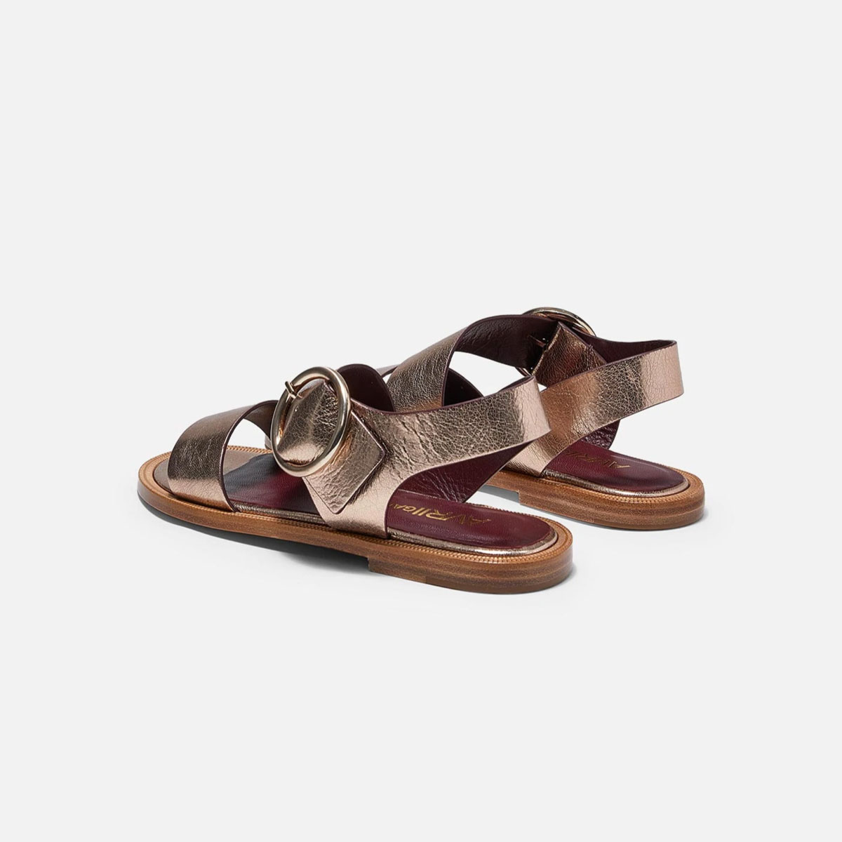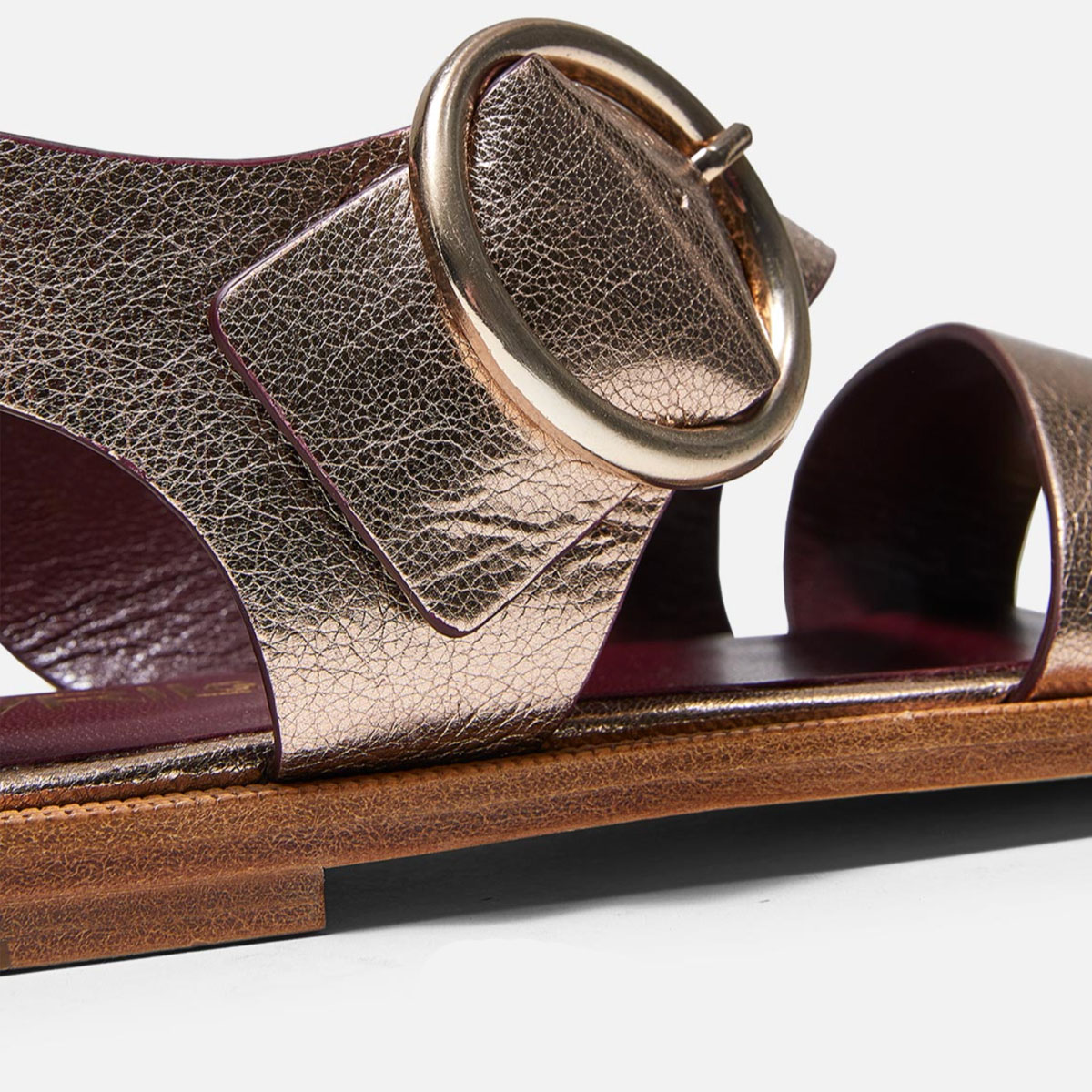 Travers est une sandale plate en cuir métallisé avec une large bride croisée à la cheville et une maxi boucle or emblématique.
