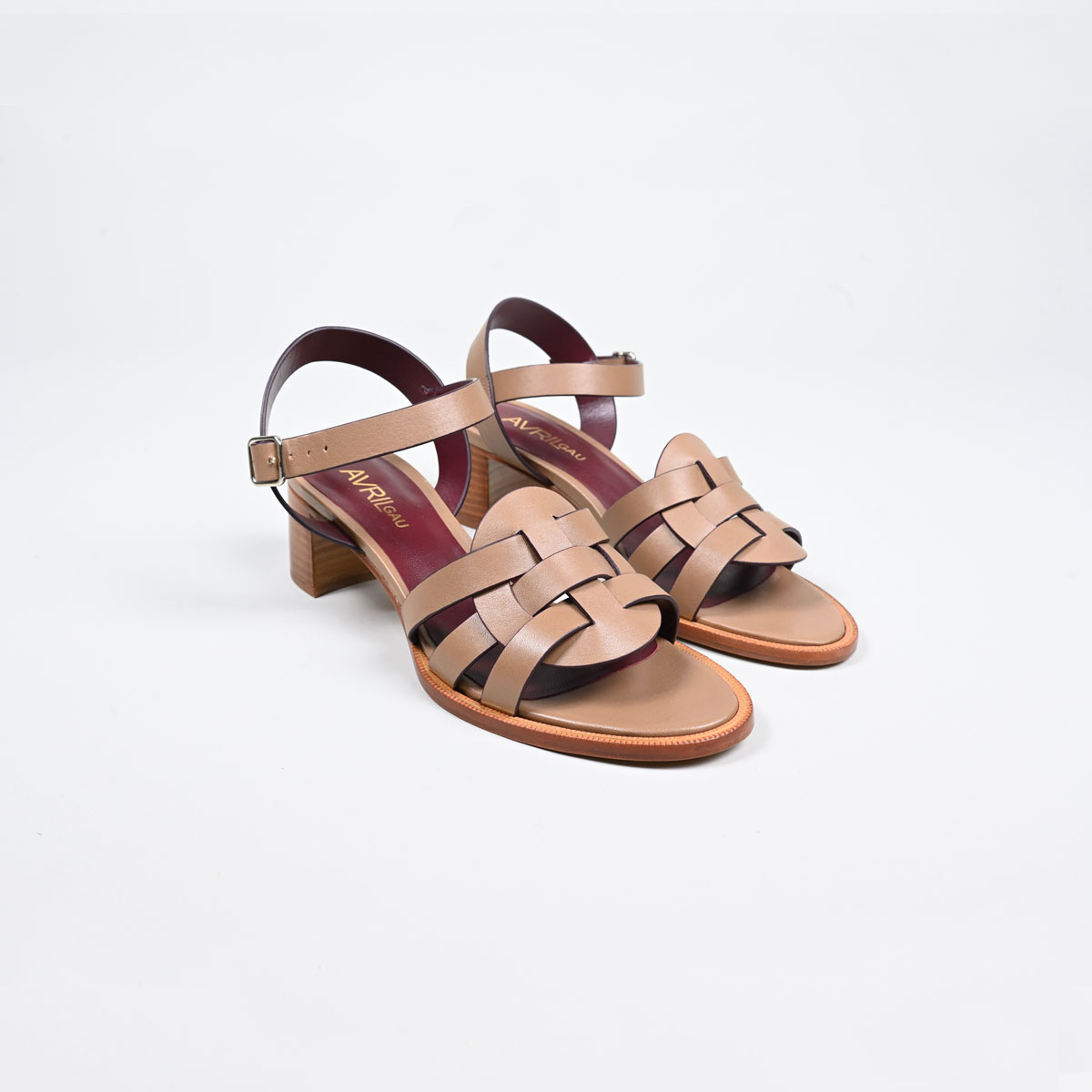 Sandales en cuir de veau plulm. Bride cheville fermée par une boucle en métal doré. Talon lamellé de cuir naturel de 6,5 cm. Semelle en cuir bordeaux. Première et doublure en cuir de chèvre bordeaux.