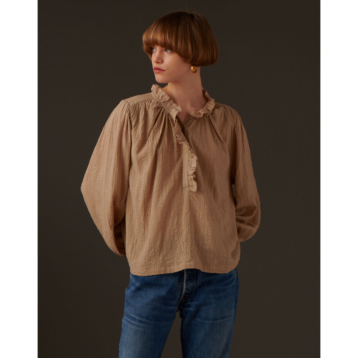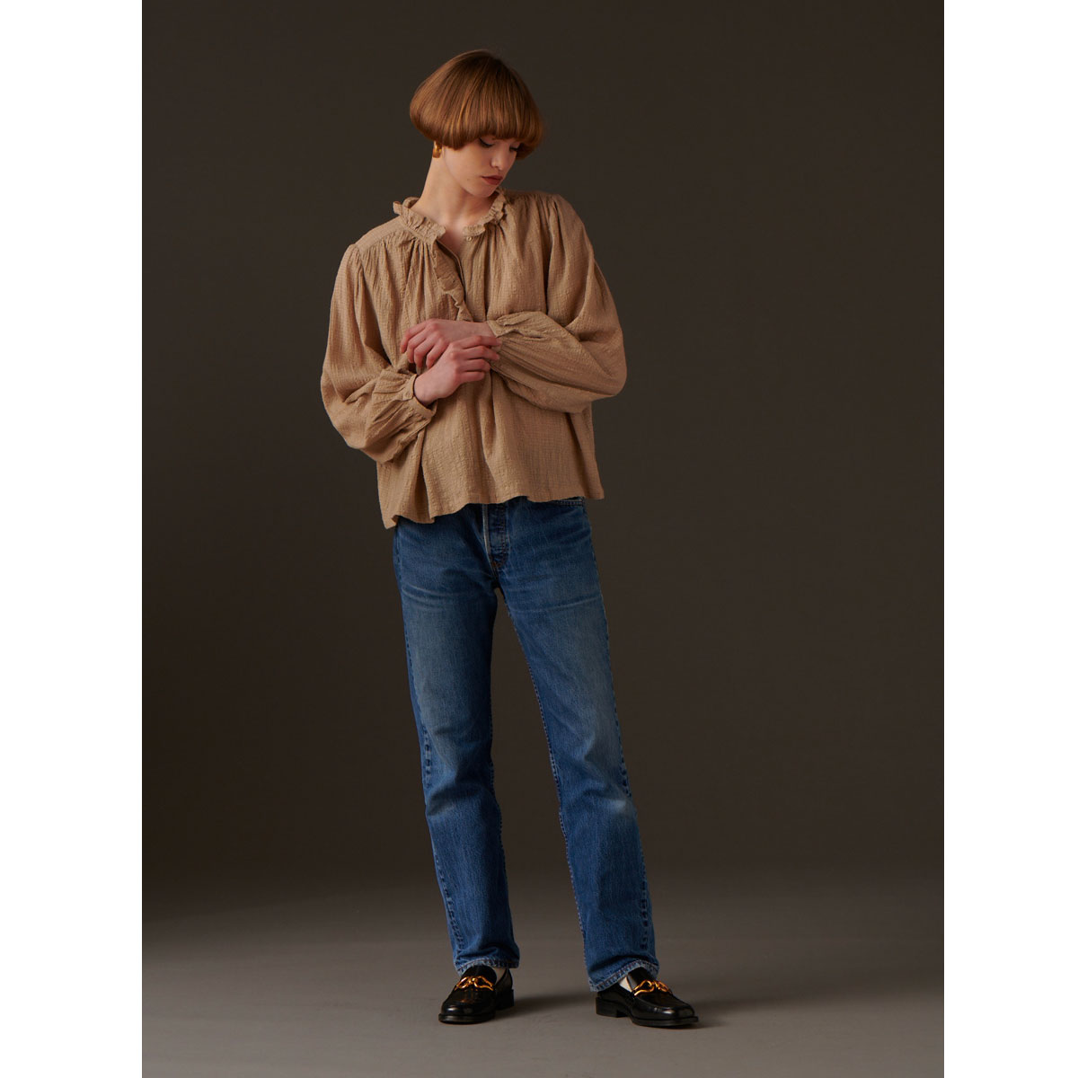 Réalisation : Blouse coupe ample, manches longues poignets resserrés par un boutonnage