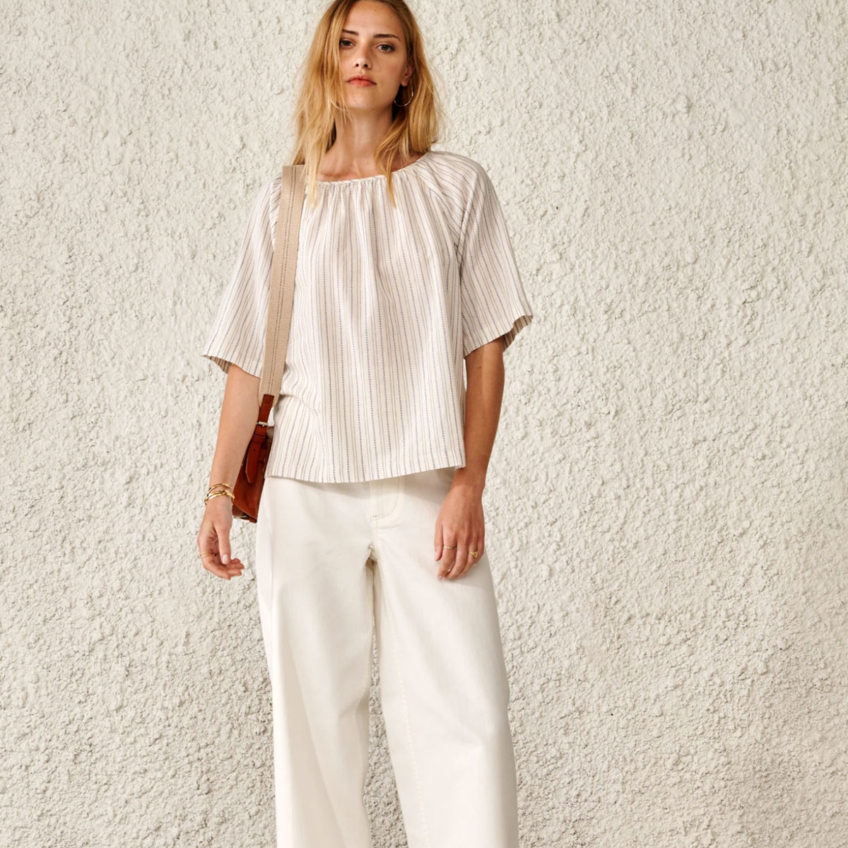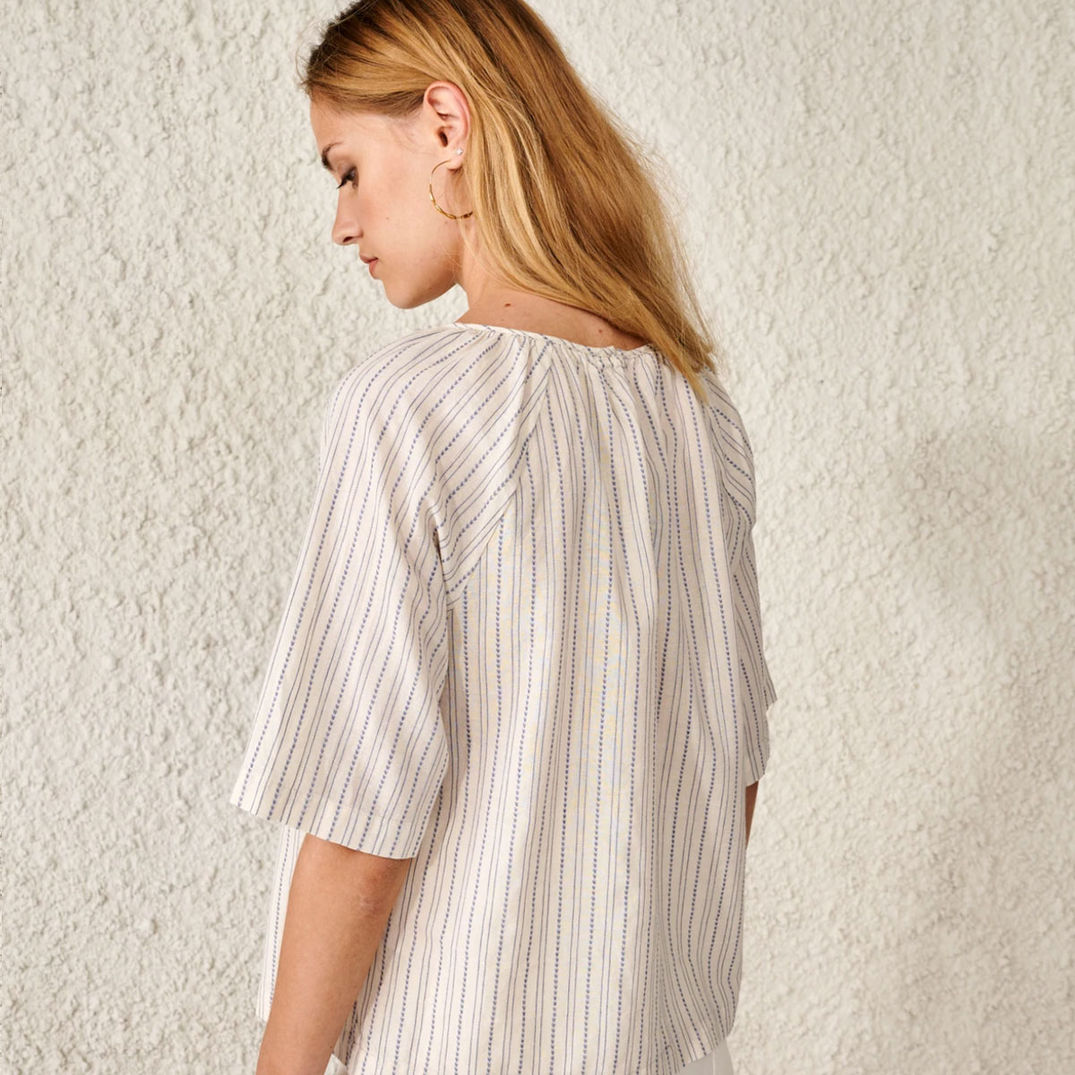 La parenthèse : Dotée de manches cintrées et d’un col froncé, elle est confectionnée dans un mélange de coton léger entièrement rebrodé de micro rayures en chevrons couleur lavande et présente l’équilibre parfait entre modernité et romantisme.