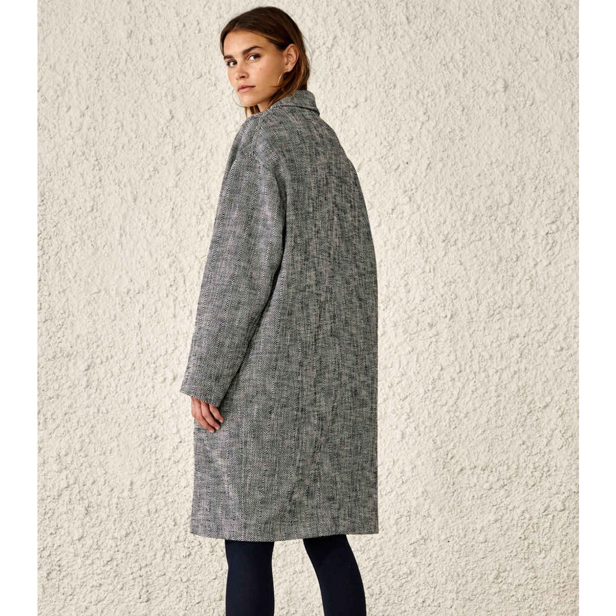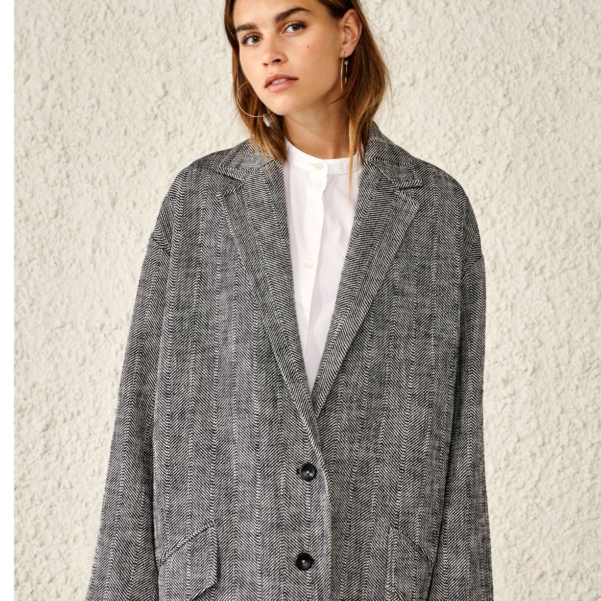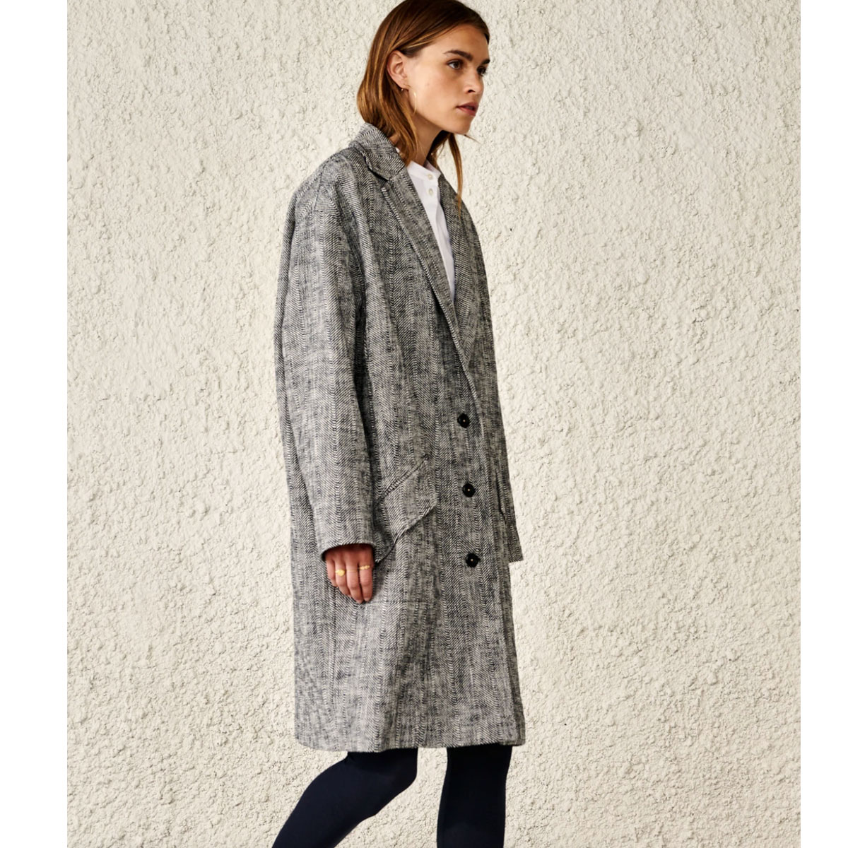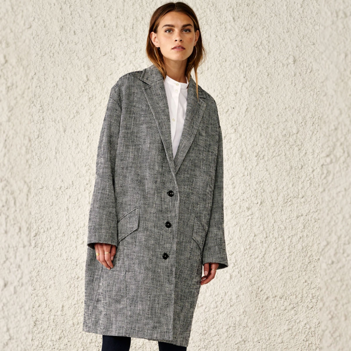 La parenthèse : Confectionné dans un mélange de coton et laine parfait pour la mi-saison, il présente une coupe croisée oversize et des détails qui mélange inspiration vintage et modernité. Sa silhouette cocon affiche des manches tombantes, un grand col à cran et des poches à rabat.