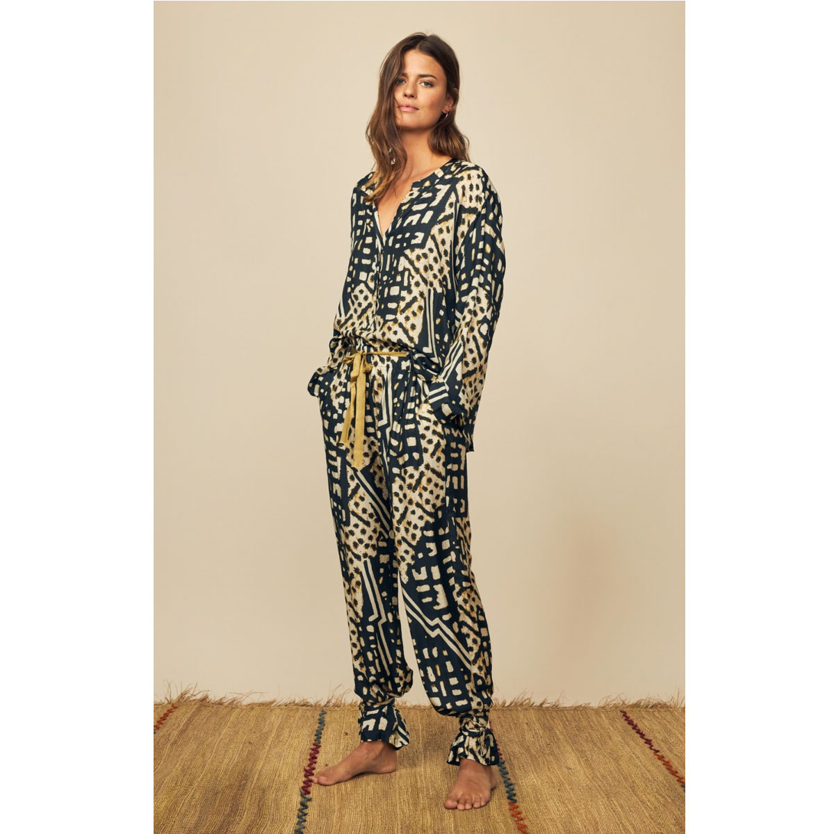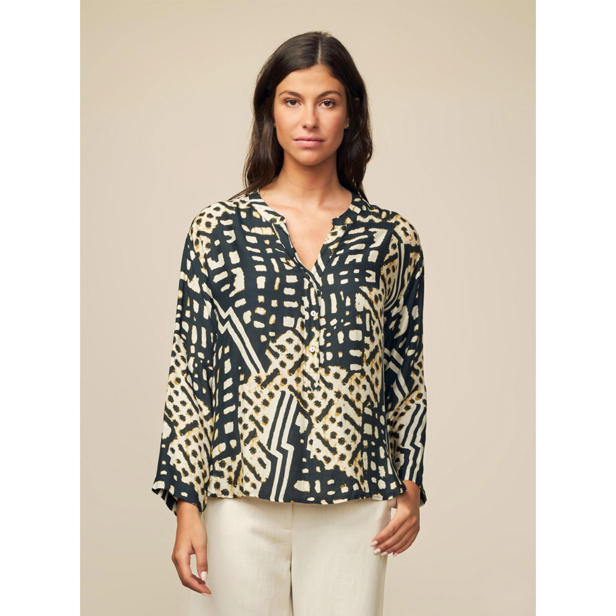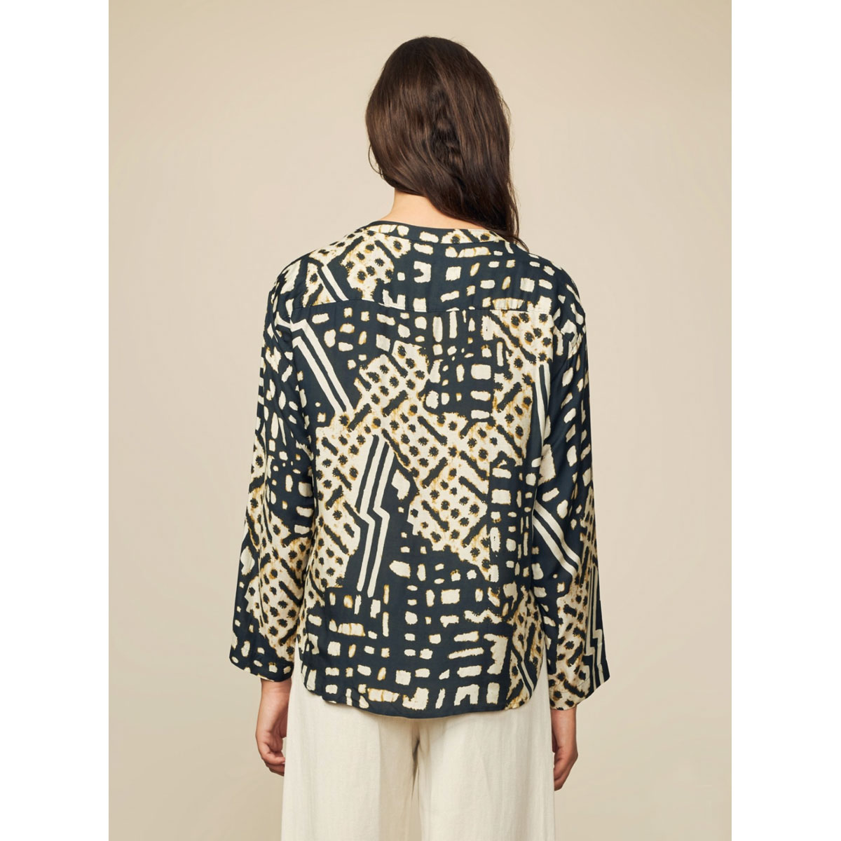 Réalisation : Chemise en soie mélangée imprimée à manches longues et col tunisien