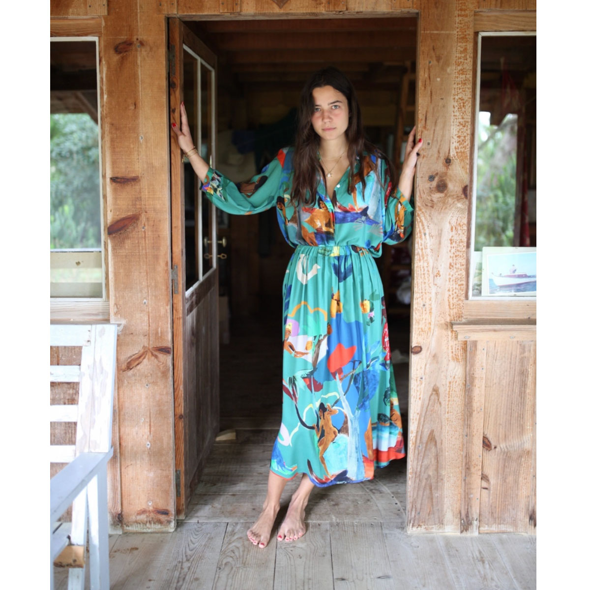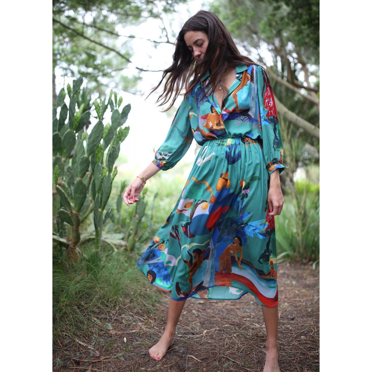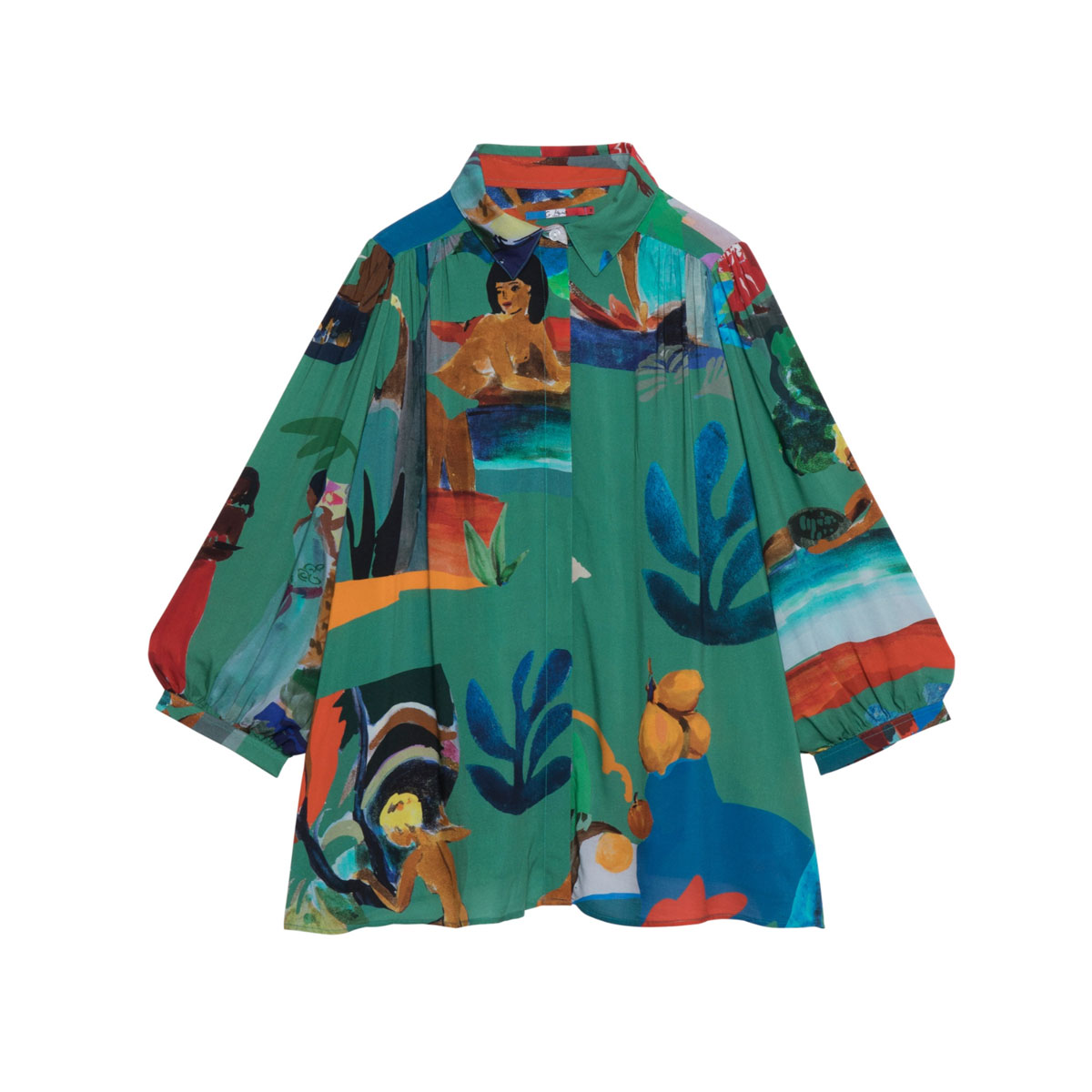 Réalisation : Blouse en viscose fluide, coupe évasée. Manches ¾ bouffantes. Un ourlet dissimule la boutonnière sur le devant. Boutons en nacre sur le poignet. Peut se porter casual par-dessus un maillot de bain ou plus structurée rentrée dans un jean. Imprimée de personnages féminins sur fond vert. Le nom de ce dessin est « Belle de Nuit Green ».