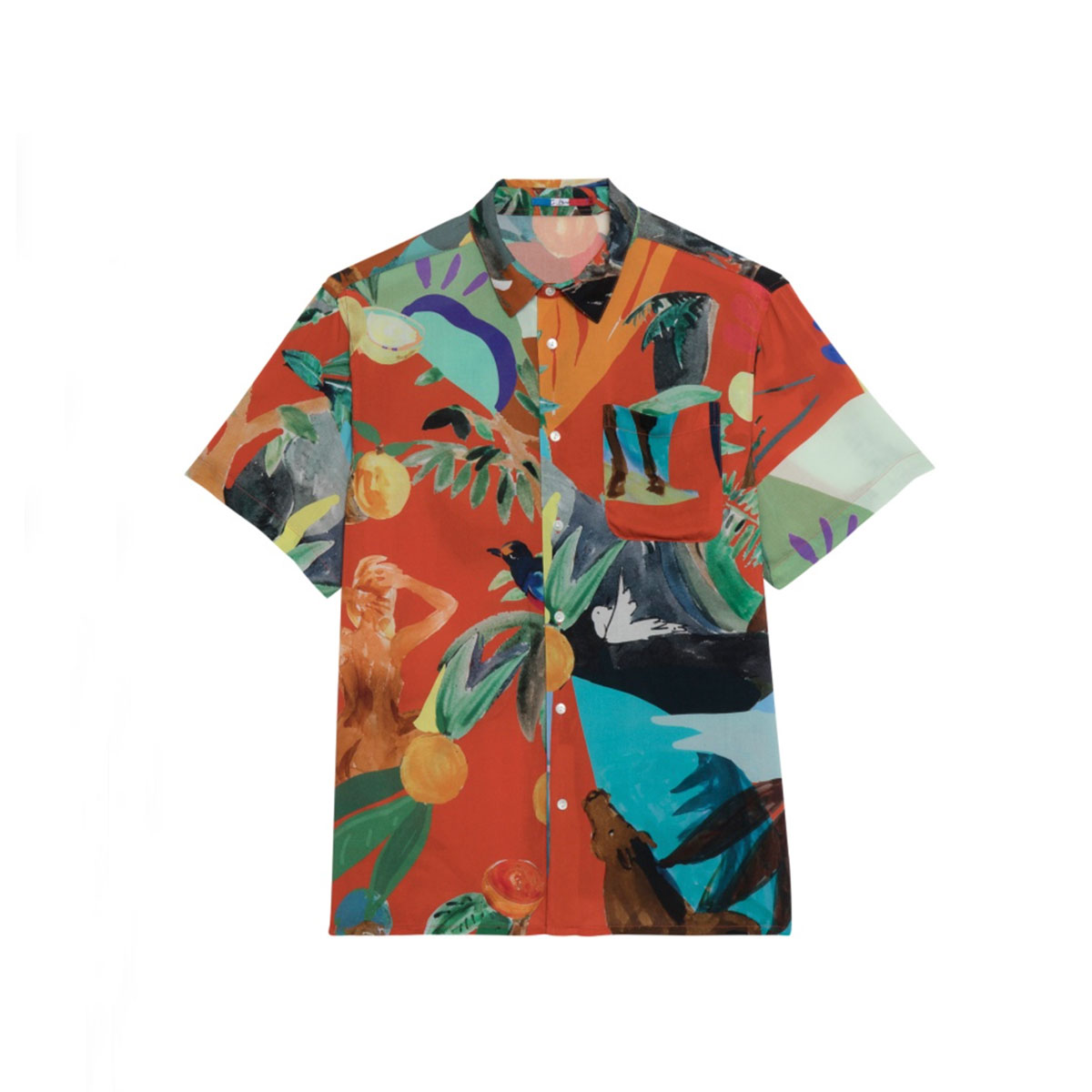 Réalisation : Chemise homme hawaïenne en viscose légère à manches courtes. Boutonnière sur le devant de la chemise. Poche poitrine sur le côté droit. Imprimé tropical qui laisse apparaître de majestueux chevaux, fruits tropicaux, jungle, sur fond rouge orangé. Le nom de ce dessin est « Rojo ».