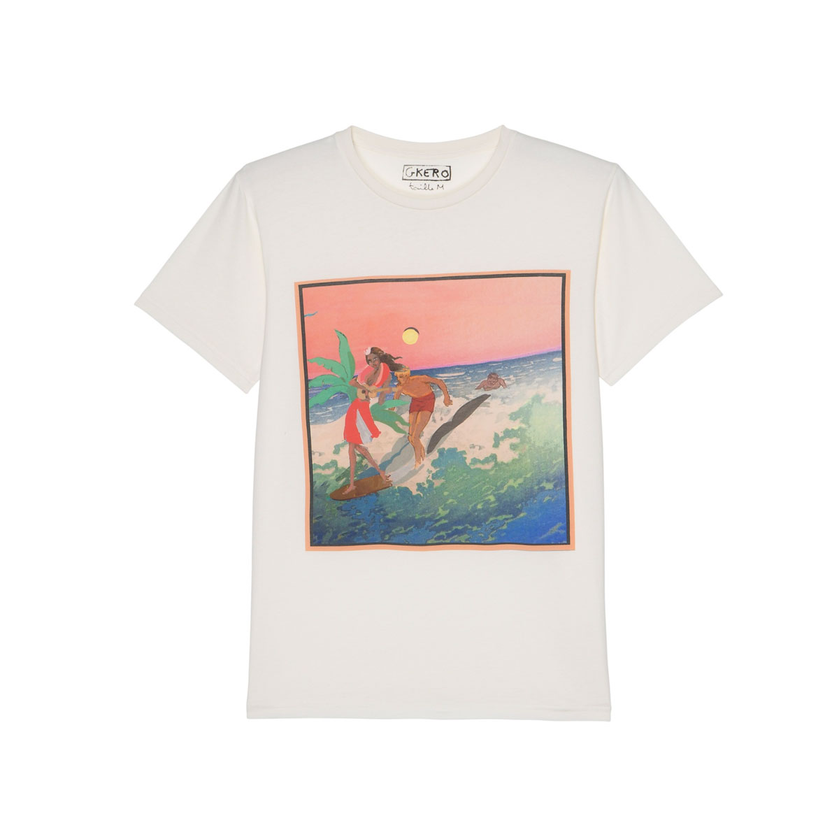 Réalisation : T-shirt homme en coton à manches courtes. Col serré. Coupe droite. Se porte casual sur un short ou plus structuré rentré dans un jean. Imprimé de deux surfeuses sur fond rose. Le nom de ce dessin est « Sunset Pink ».
