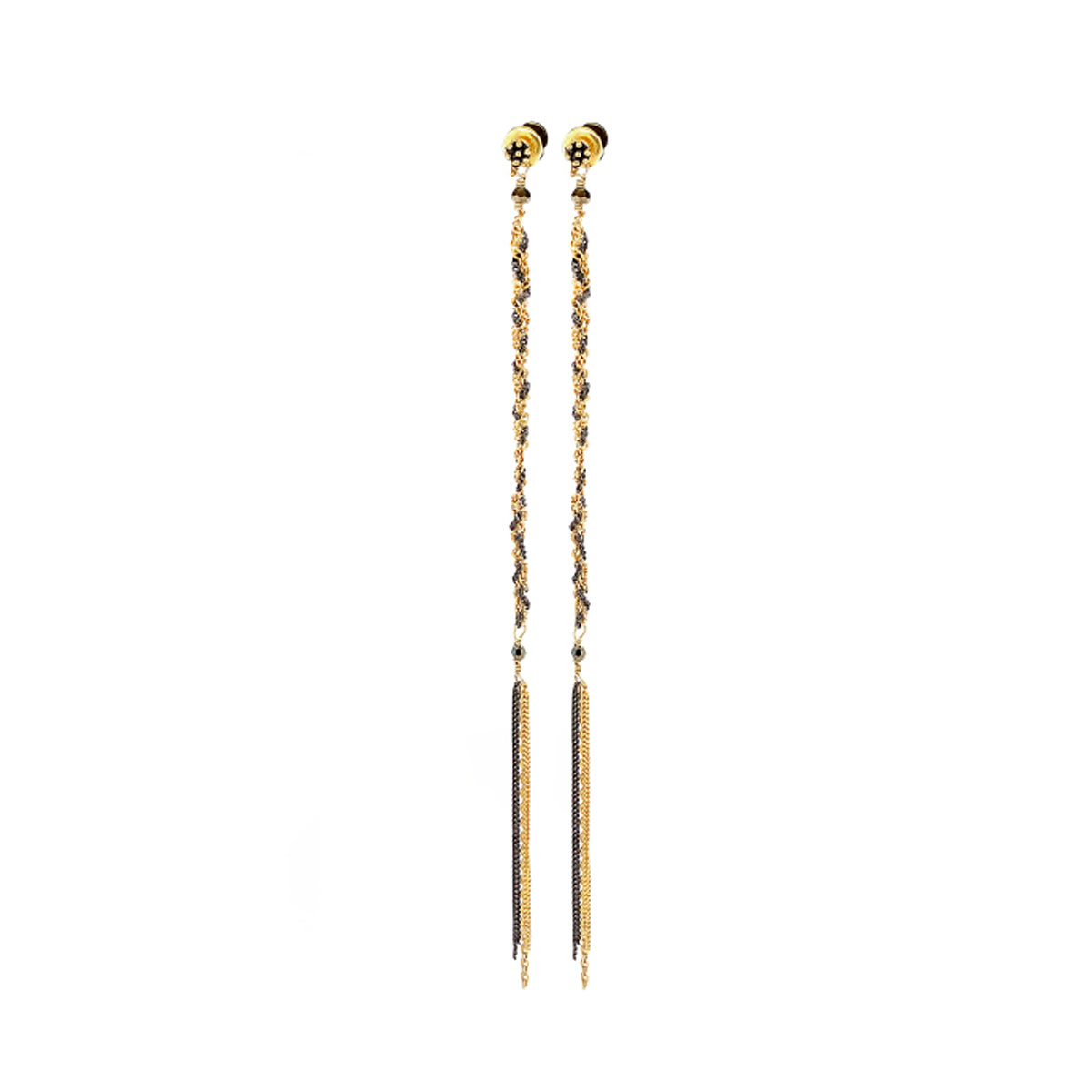 Réalisation : Paire de boucles d’oreilles tressées en argent massif composée de plusieurs fines chaînes dorées et de deux pierres en cristal.