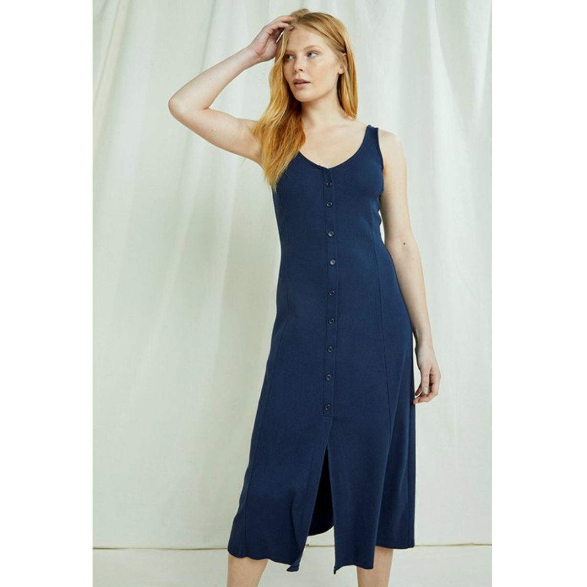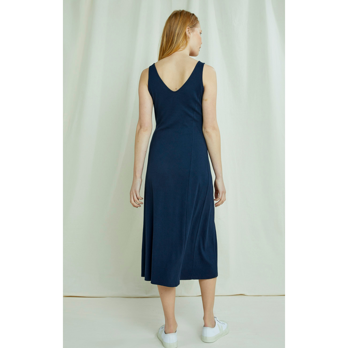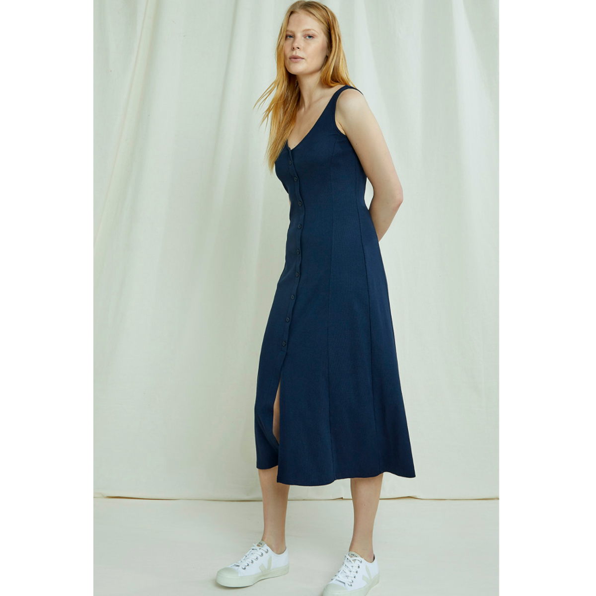 Réalisation : Robe en jersey sans manches en coton biologique certifié GOTS avec une finition en jersey avec une fine texture côtelée. Dans une teinte marine classique avec un col bas, une fente sur le devant et boutonnée avec des boutons en corozo respectueux de l’environnement.