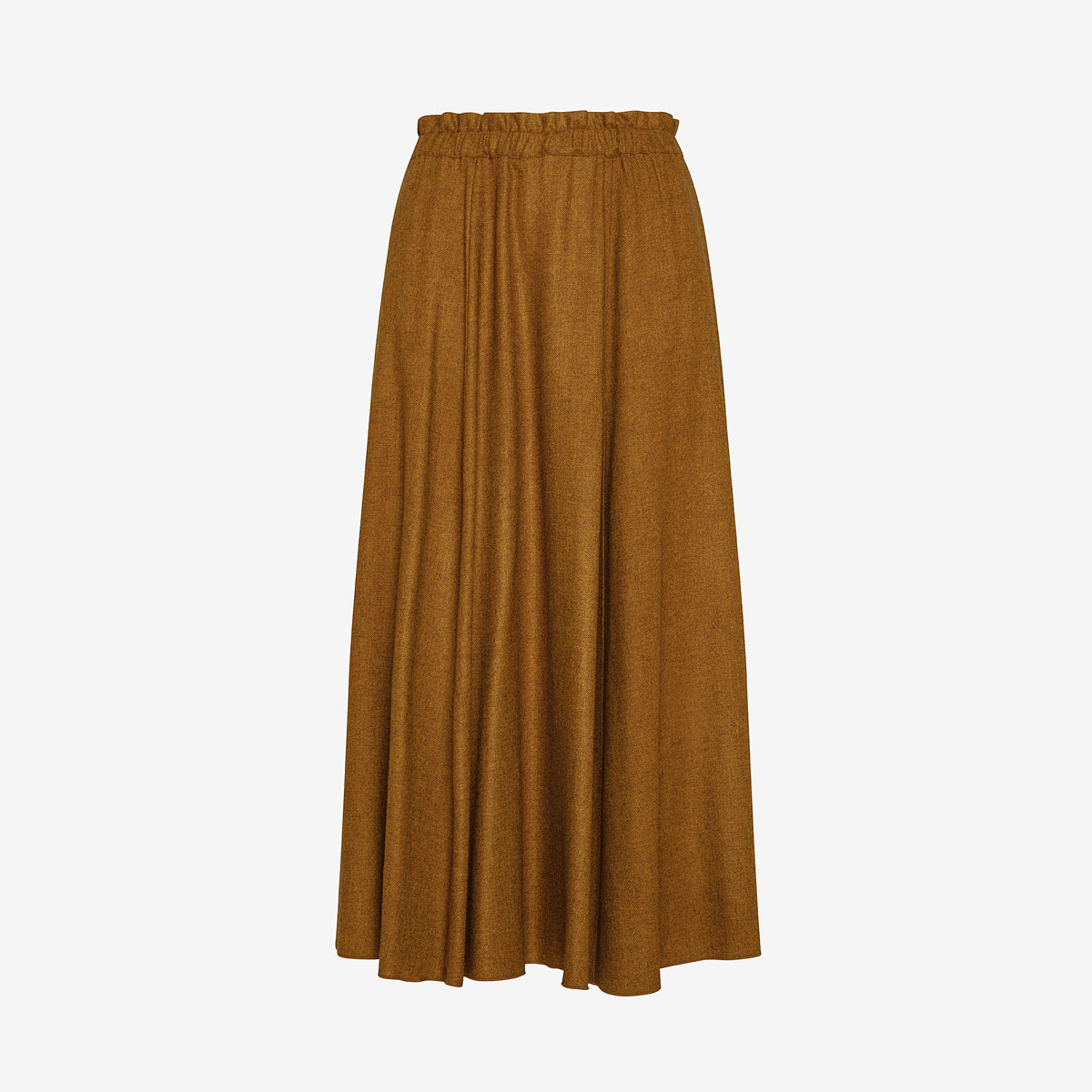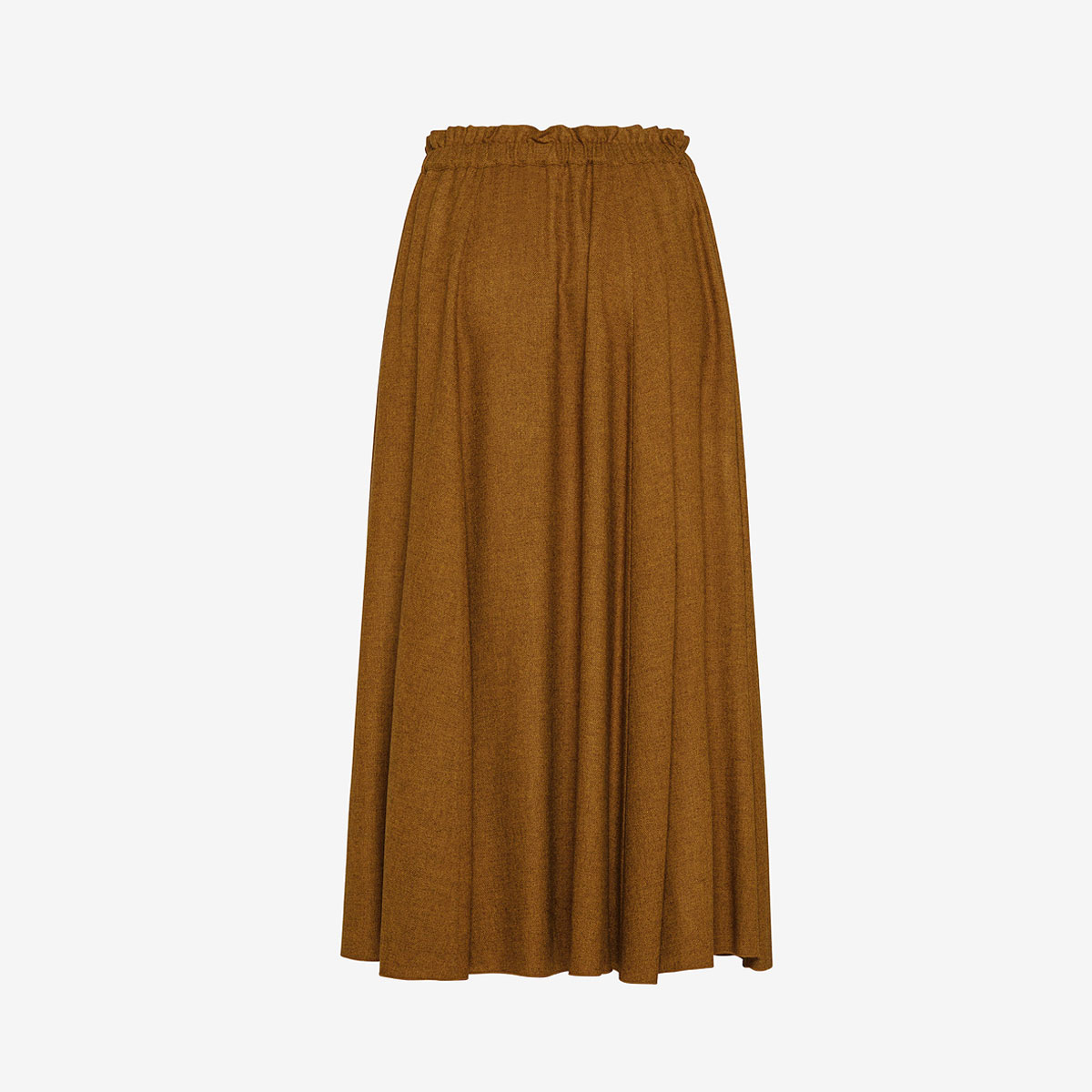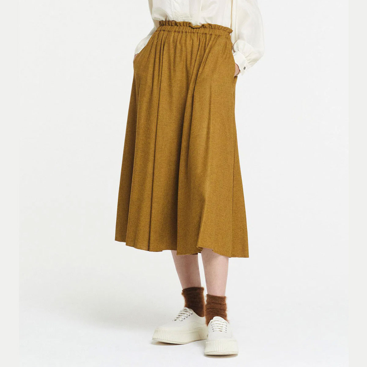 Réalisation : Jupe fluide en flanelle de viscose et laine. Longueur midi et élastique avec taille froncée.