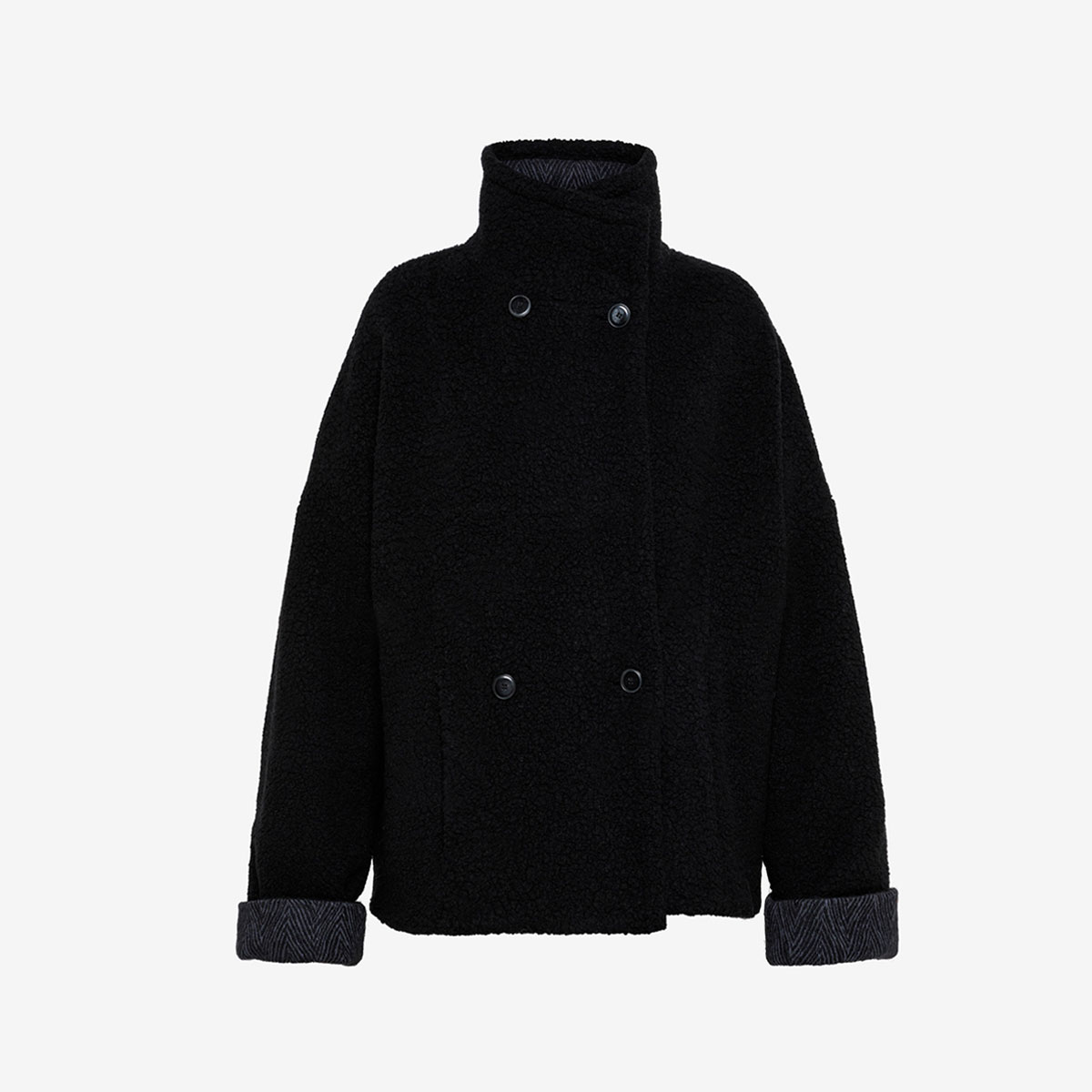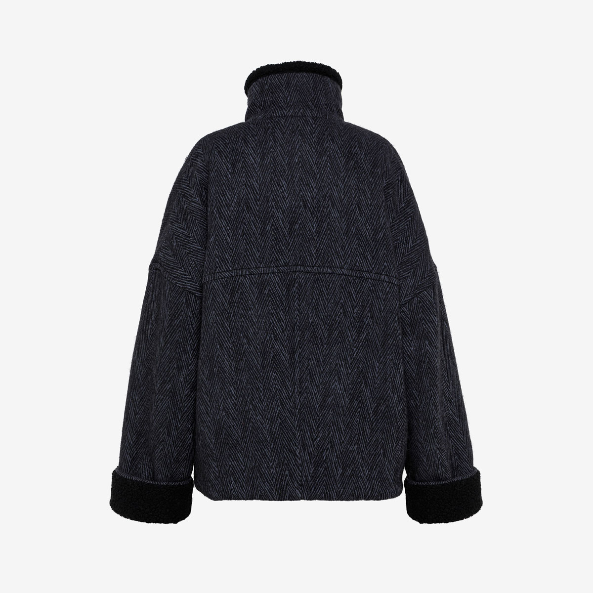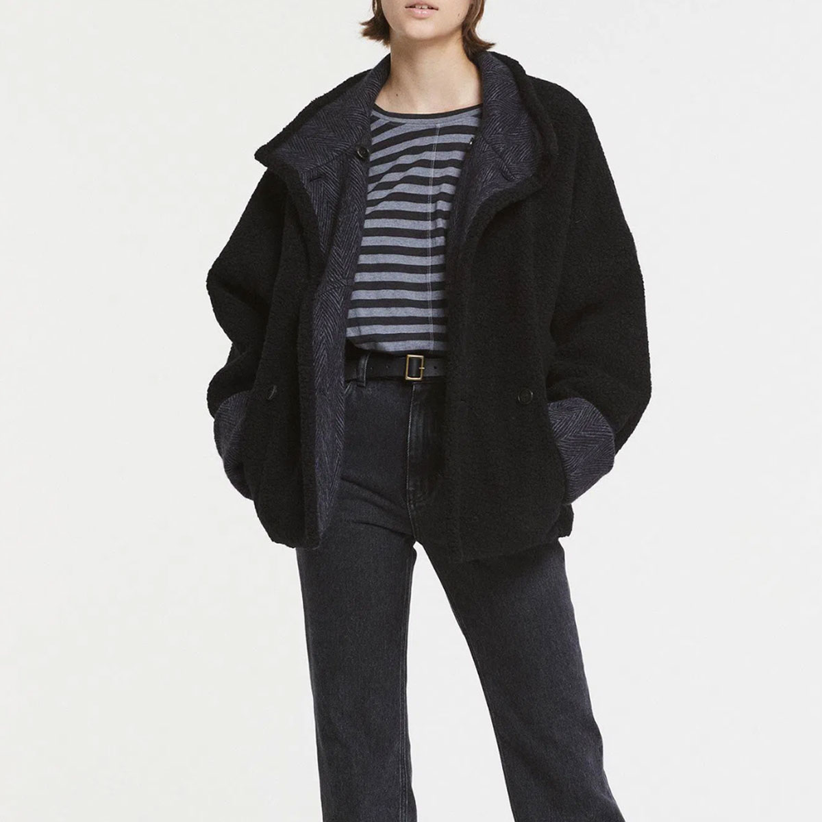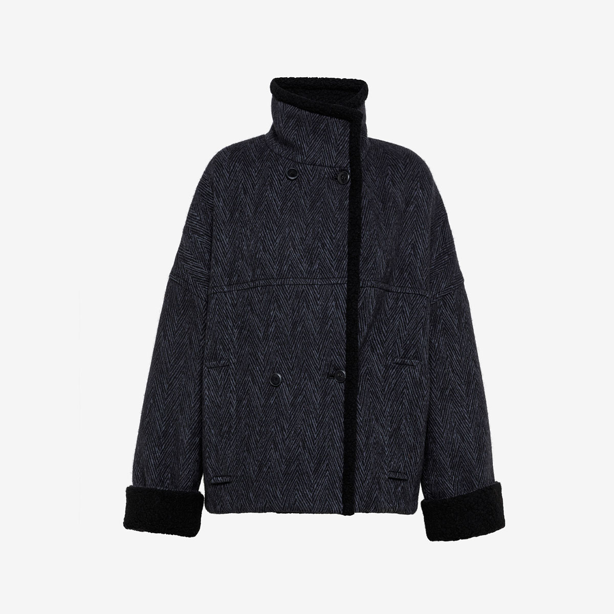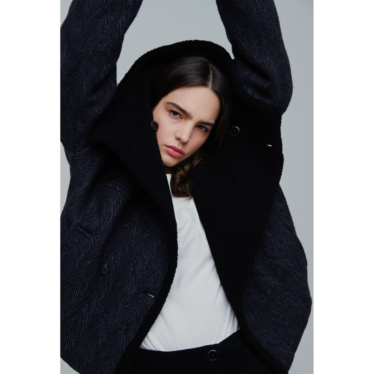 Réalisation : Veste réversible en laine et coton à chevrons. Col haut, découpes devant, poches latérales et fermeture à double boutonnage avec boutons apparents.