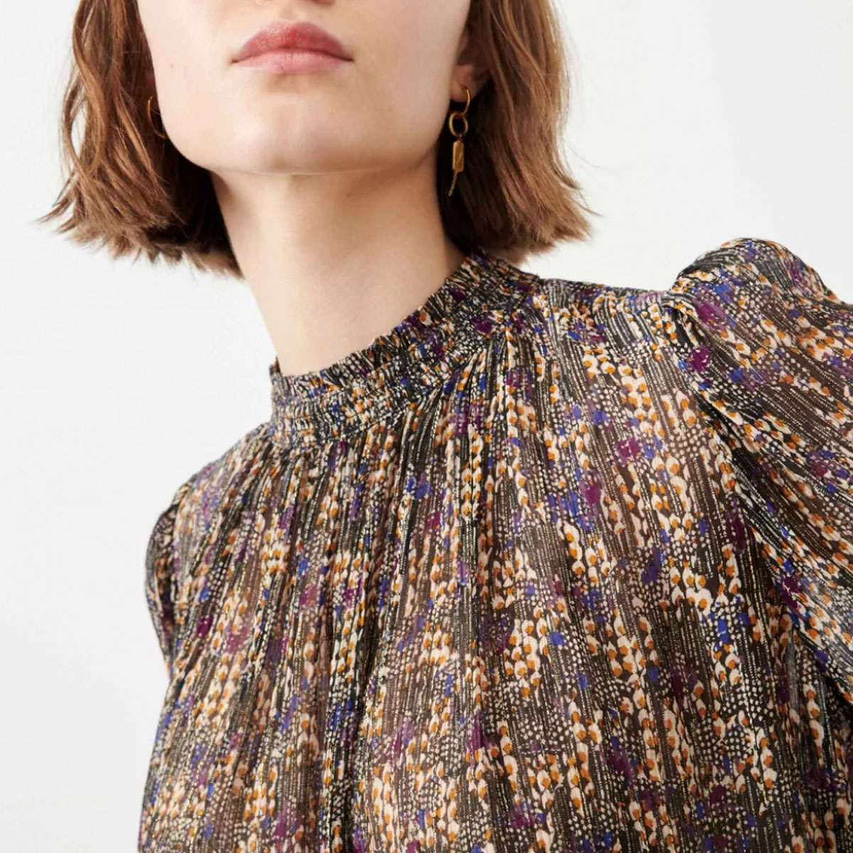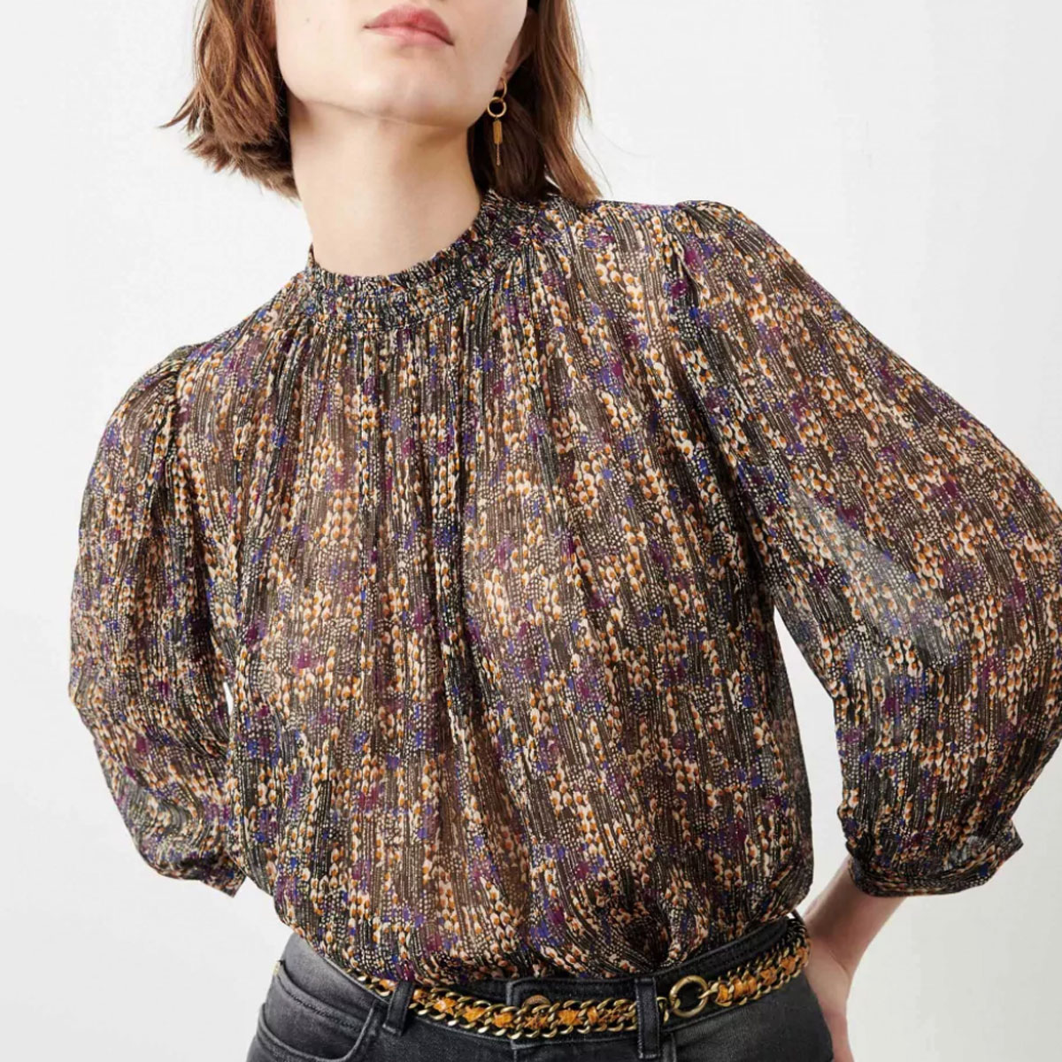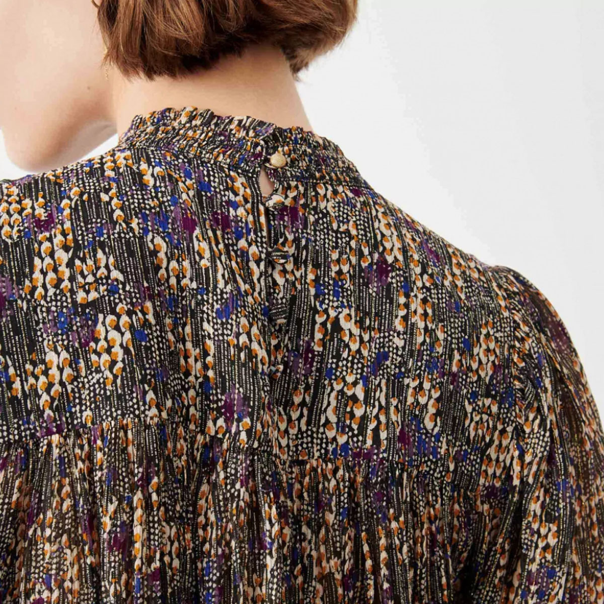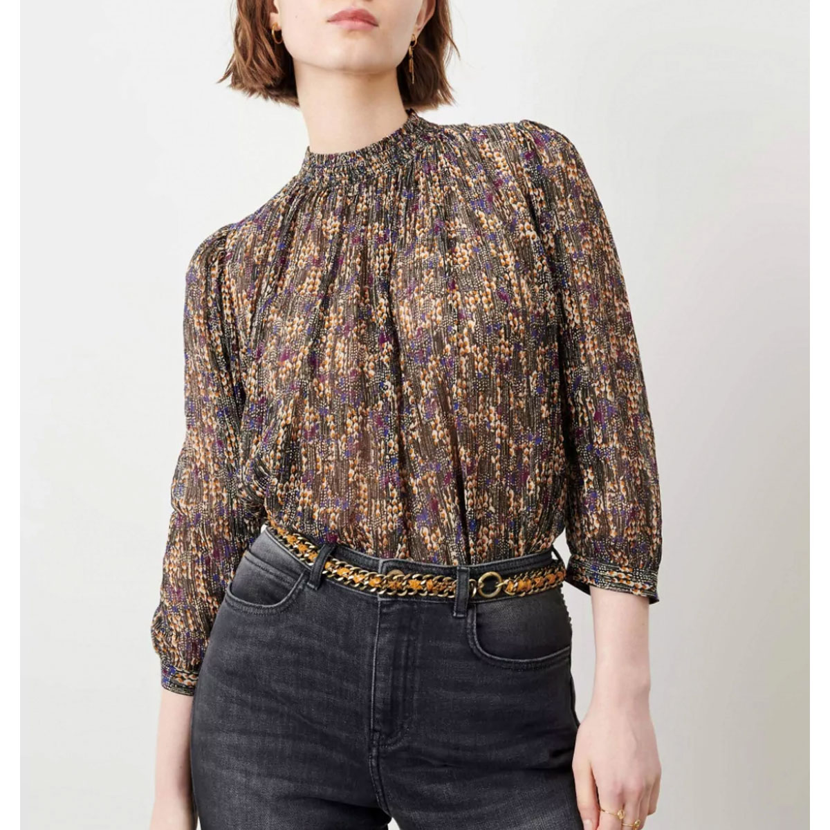 Réalisation : Blouse Lysie en mousseline imprimée à fines rayures métallisées, motif exclusif Sessùn