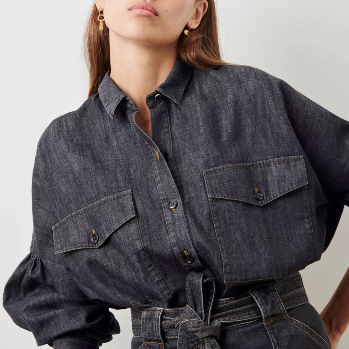 Réalisation : Chemise ample Botania en denim stonewashé de coton organique avec des détails de sûrpiqures contrastées.
