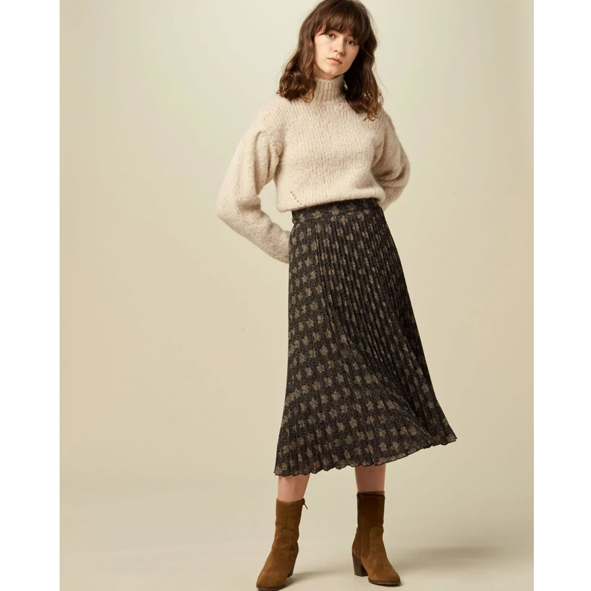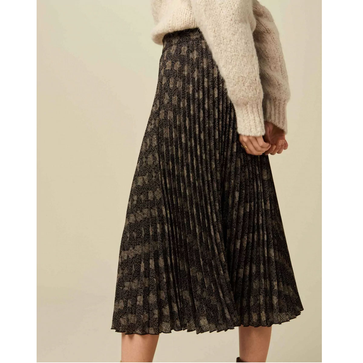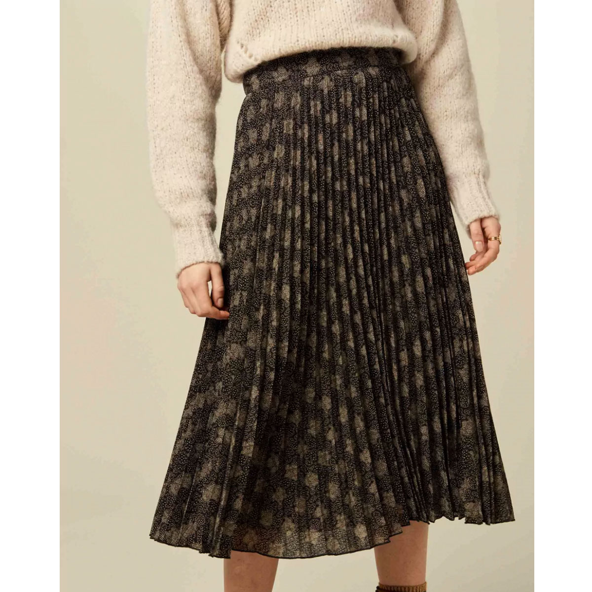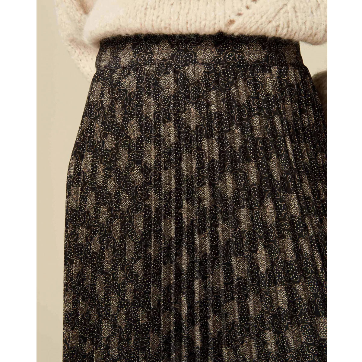 Réalisation : Jupe longue plissée soleil Nu Coleen en voile crêpon imprimé, motif exclusif Sessùn.