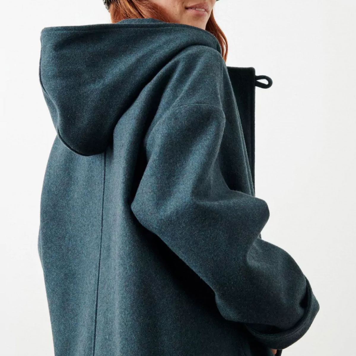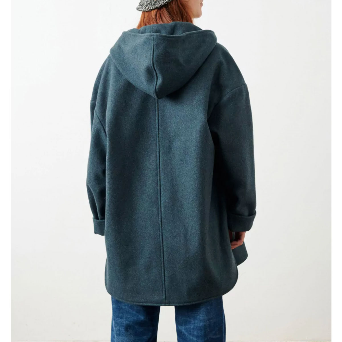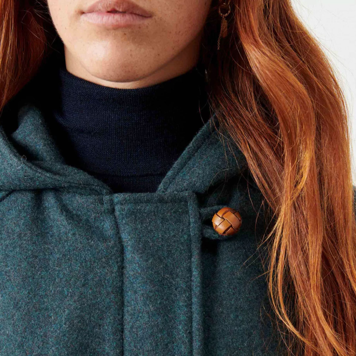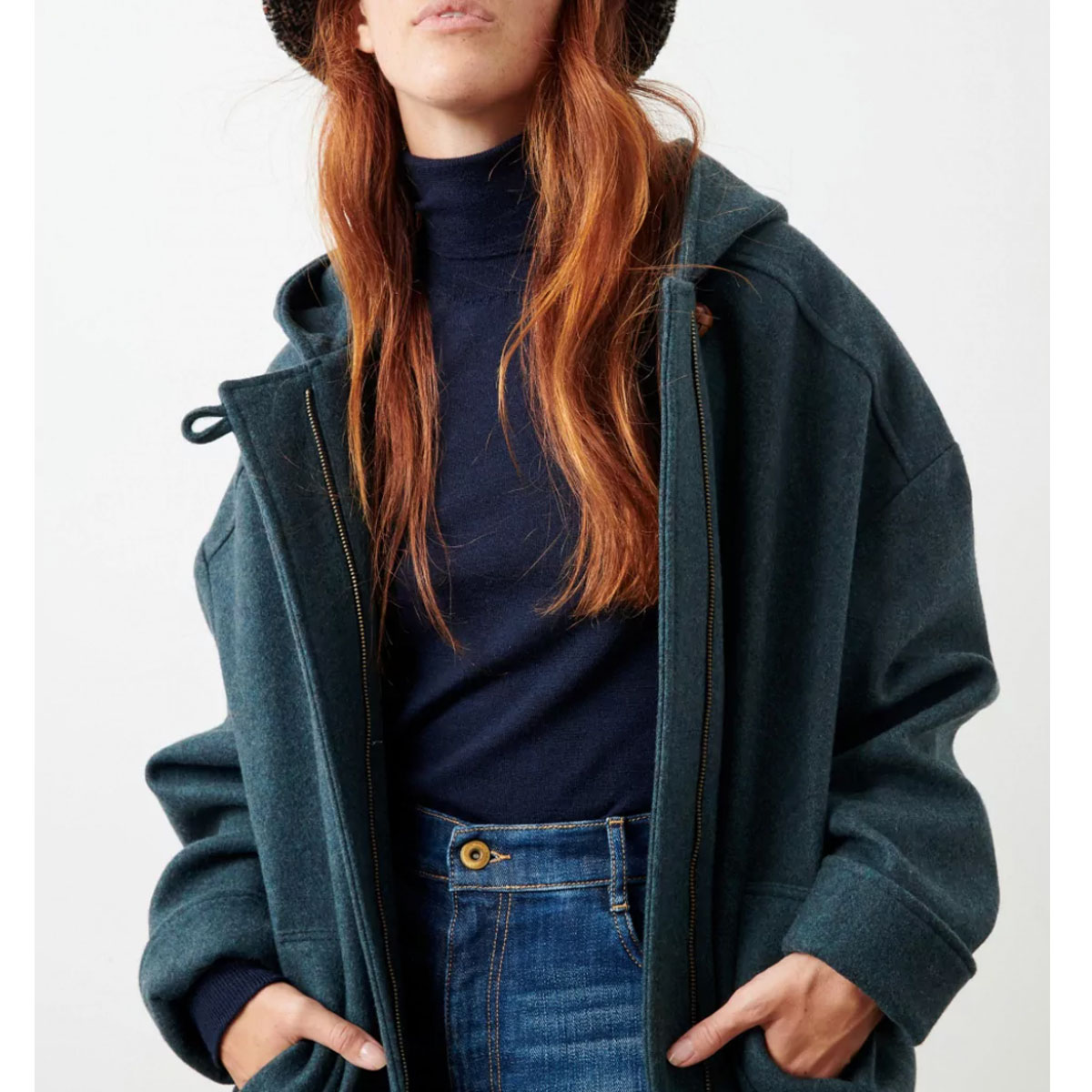 Réalisation : Manteau à capuche oversize Nana en drap de laine recyclée, tissé en Italie.