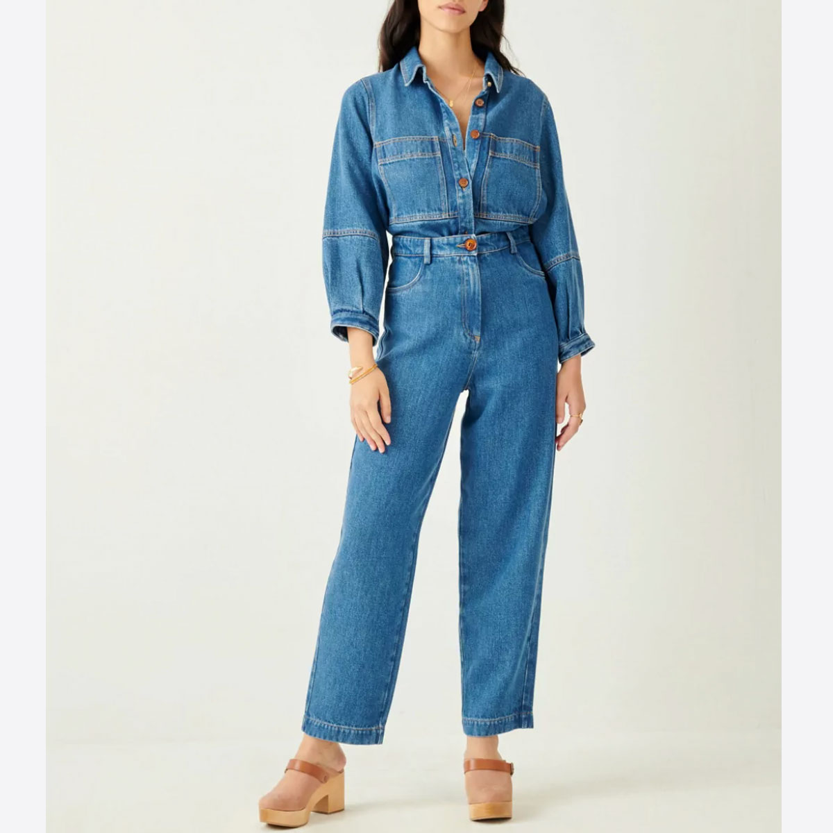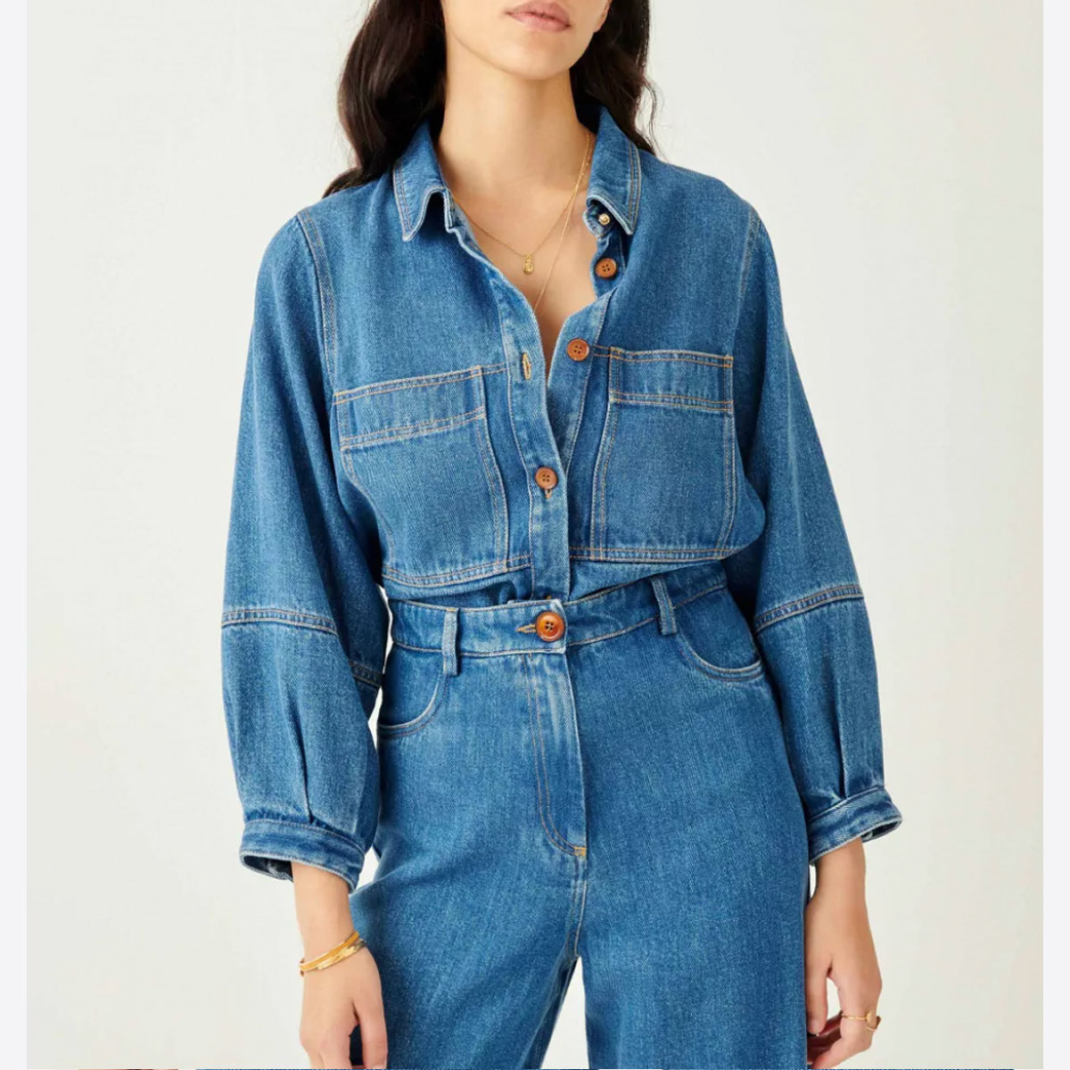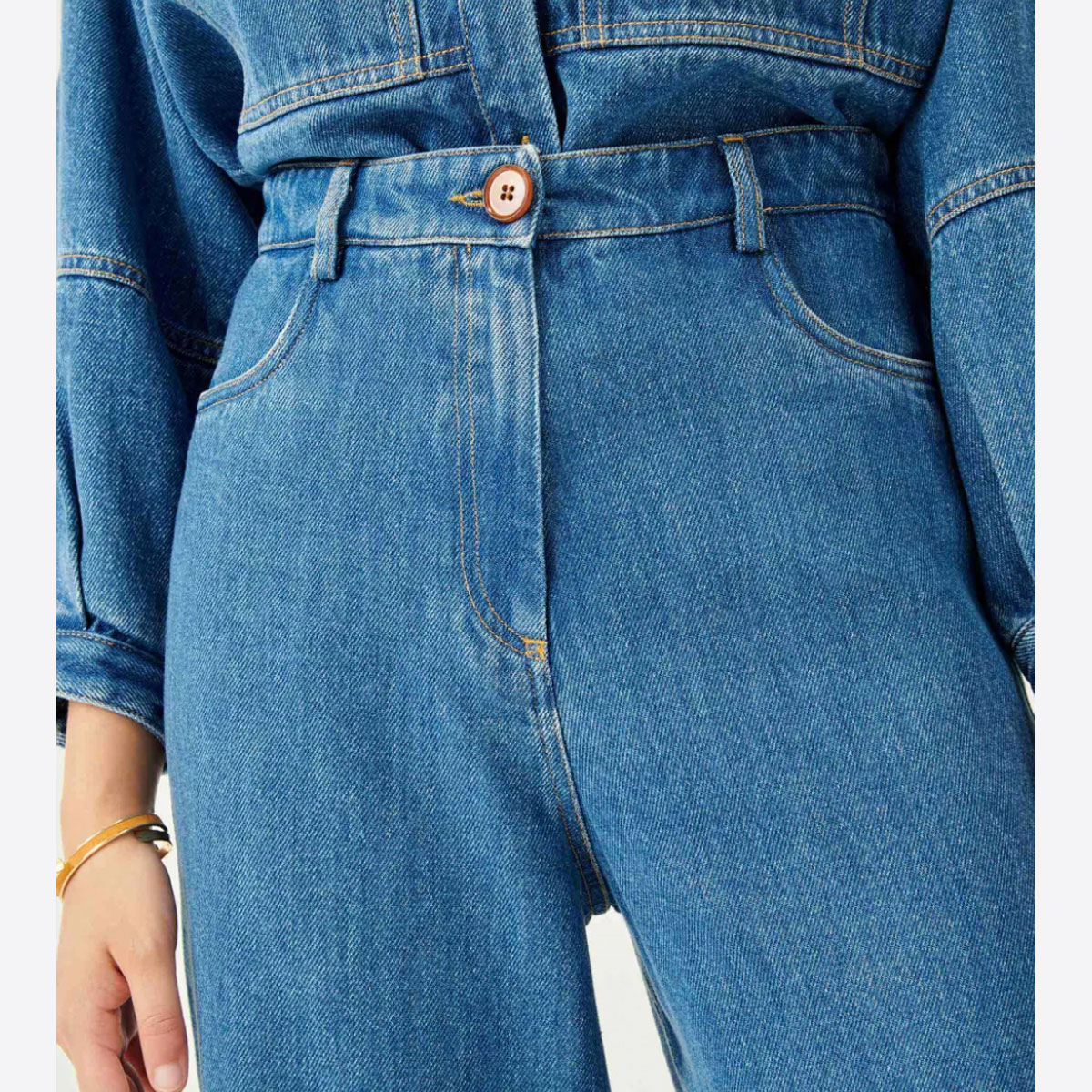 Réalisation : Pantalon rond taille haute Nica en denim léger stonewashé.