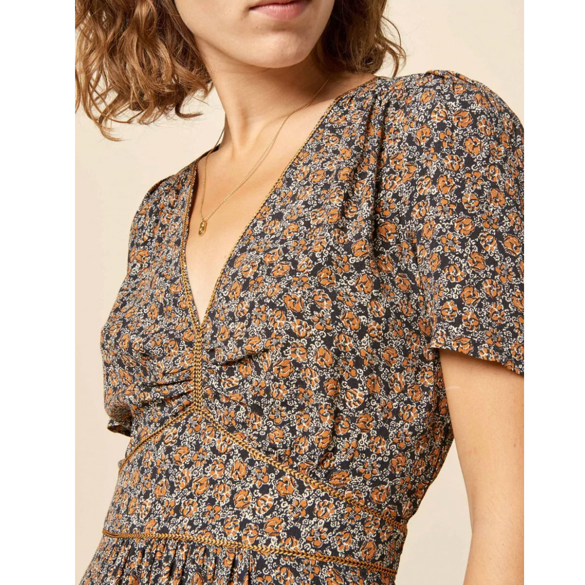 Jeux de fronces aux épaules, à la poitrine et à la taille.