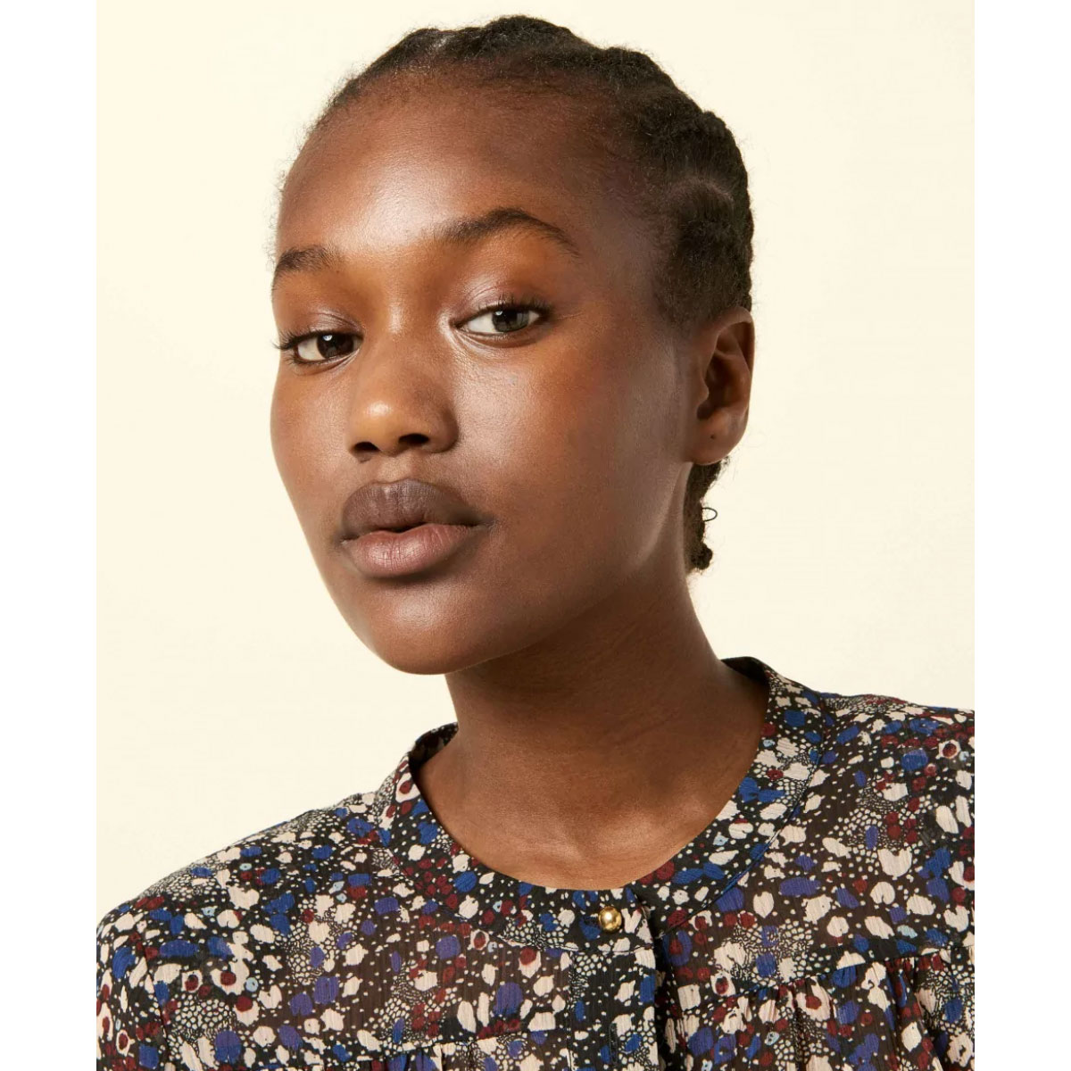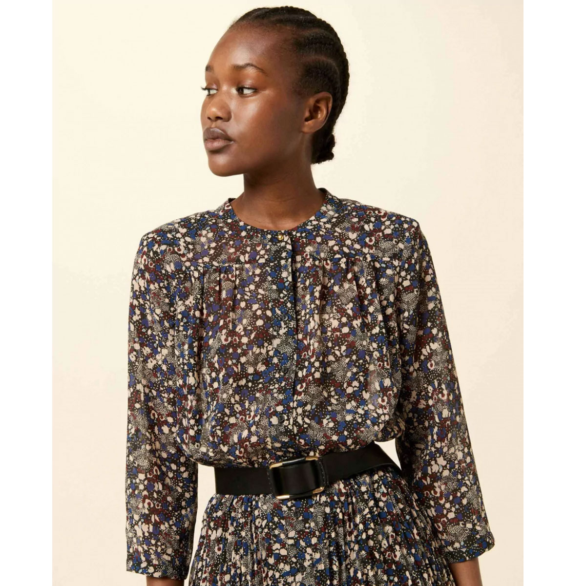 Découpes et jeux de fronces à la poitrine et à la taille. Poignets fendus avec boutons bijoux.
